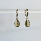 Boucles d'oreilles de type dormeuses ornées d'un pendentif en forme de goutte en pierre de verre couleur olive.