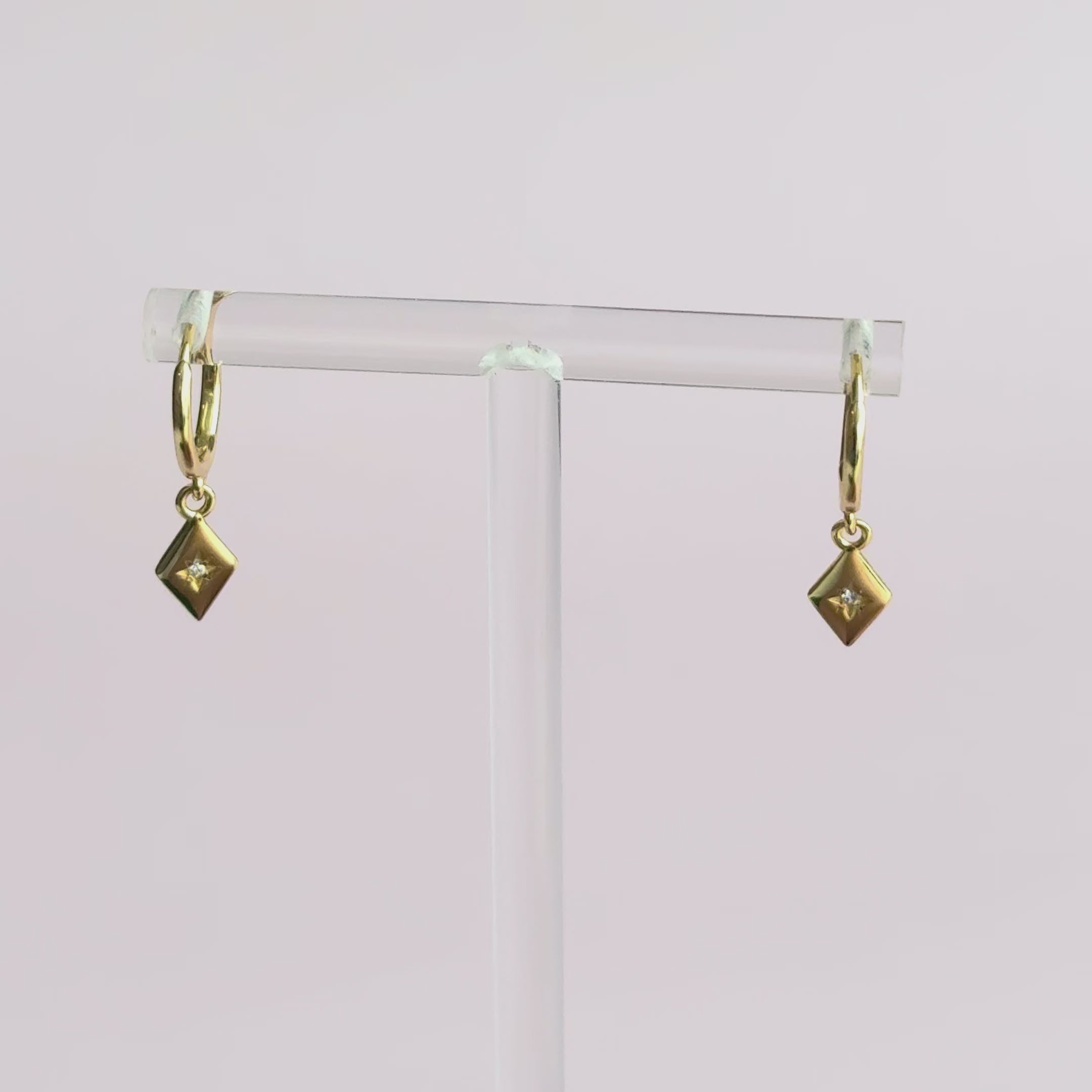 Boucles d'oreilles délicates de types anneaux avec pendentif losange et petit zircon incrusté.