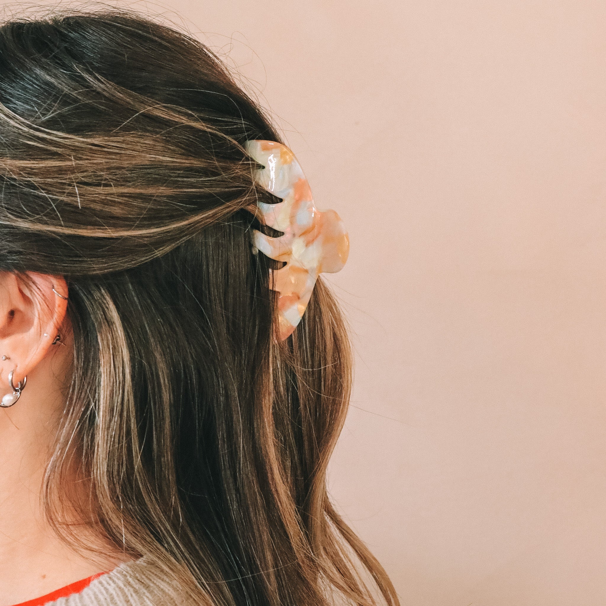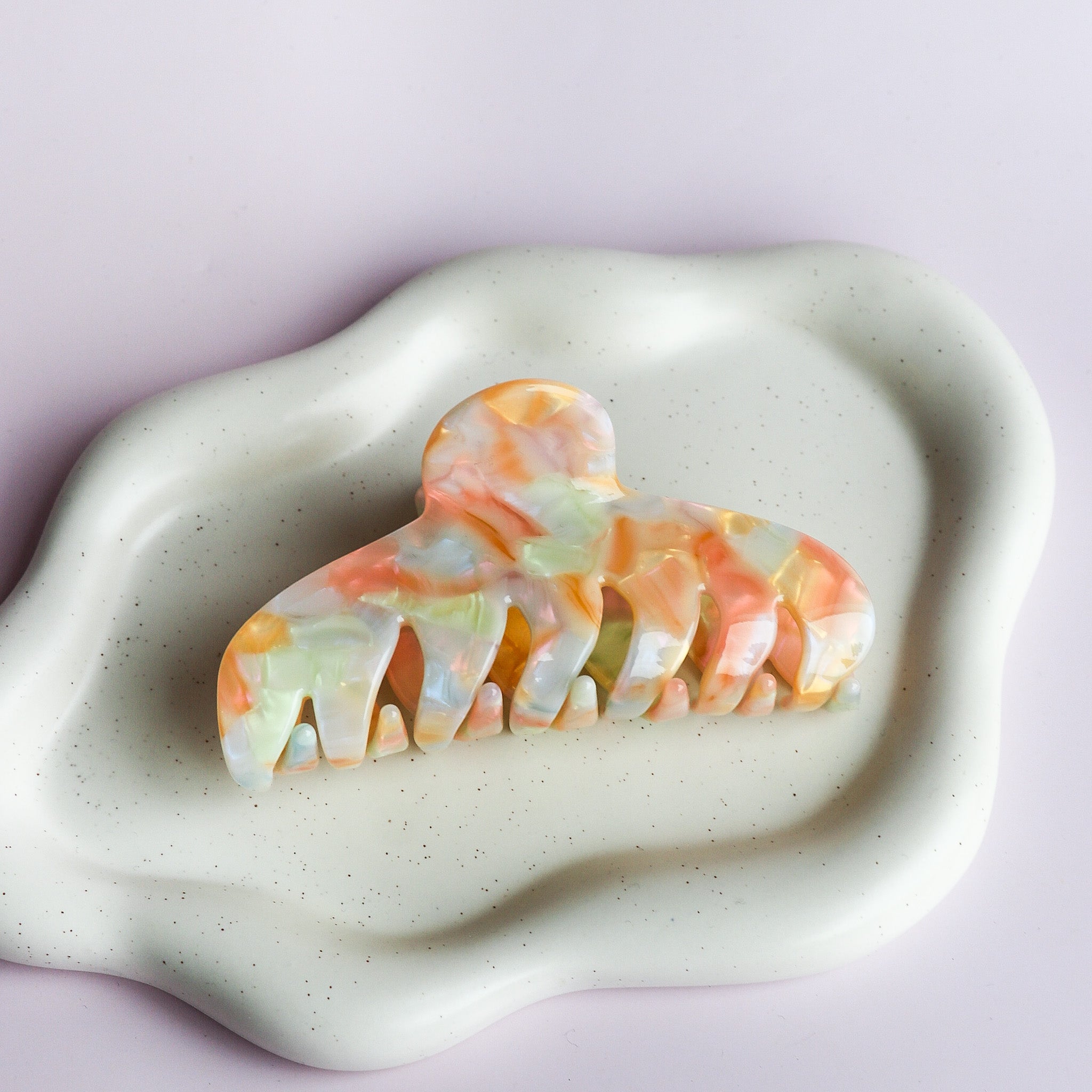 Pince à cheveux de forme arrondie aux couleurs pastels. La Agatha est solide et est capable de retenir les chevelures les plus denses.