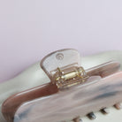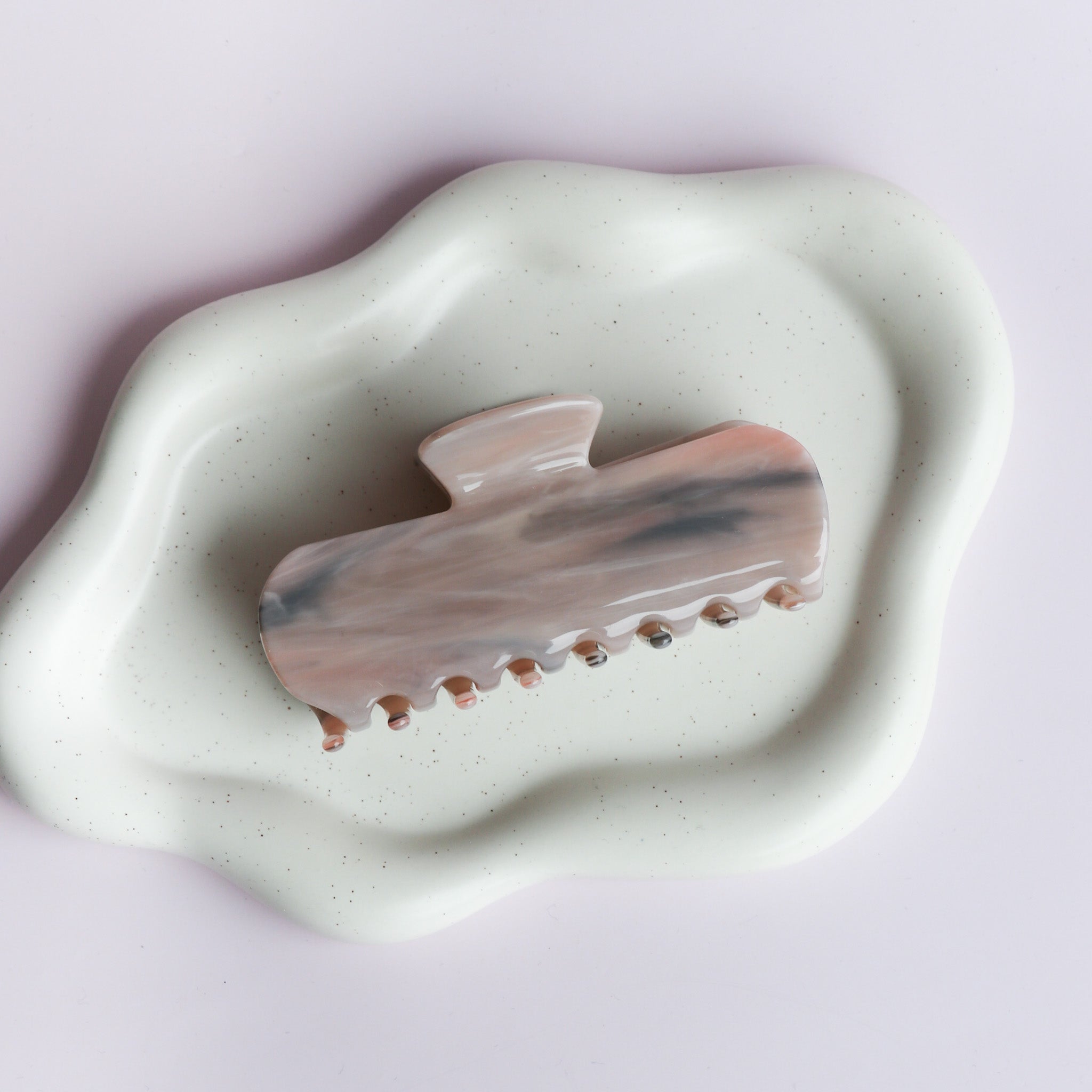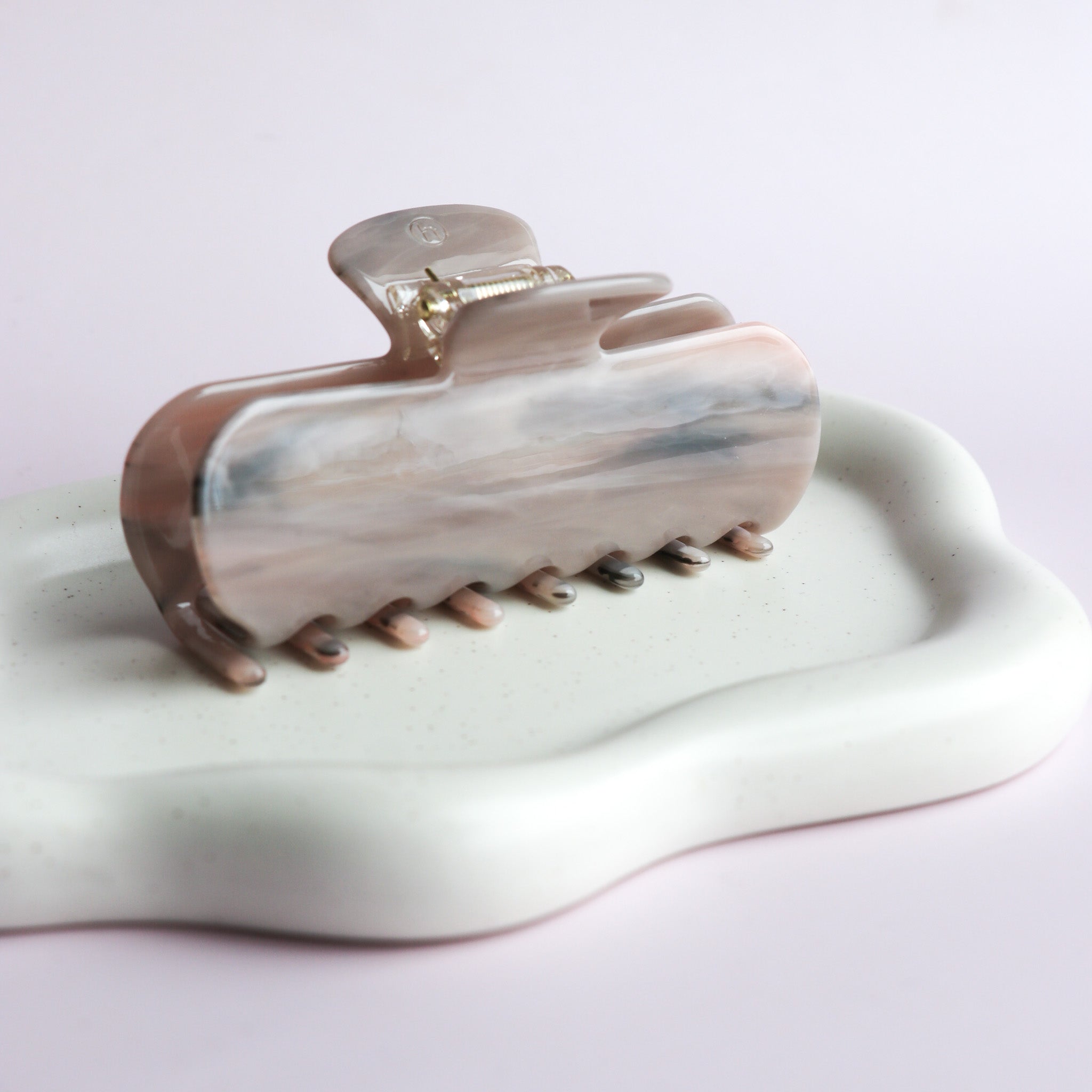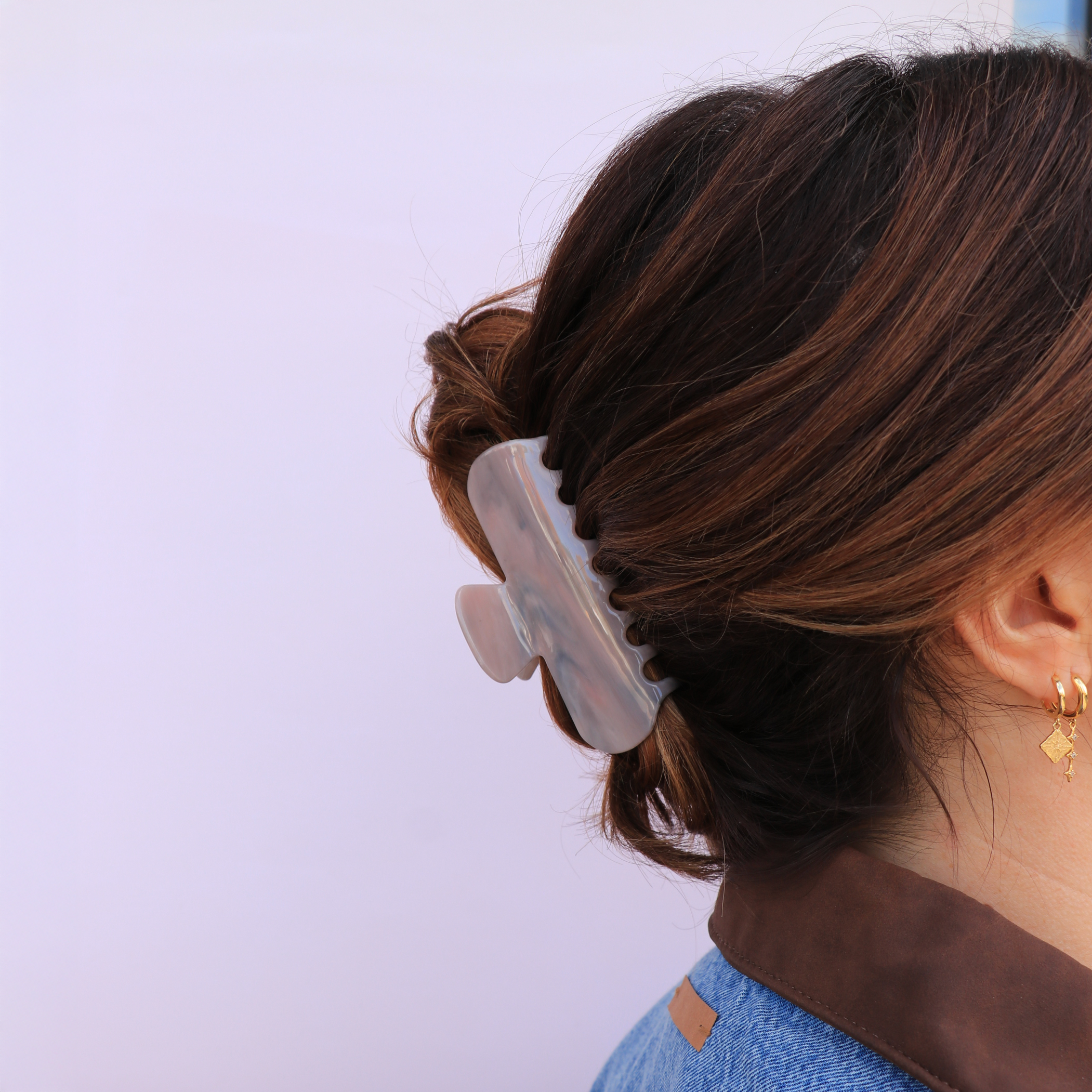 Pince à cheveux de forme rectangulaire aux coins arrondis. Parfaite pour les cheveux longs, en couette complète ou en demi-couette dans les teintes de gris et rose.