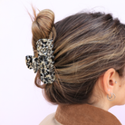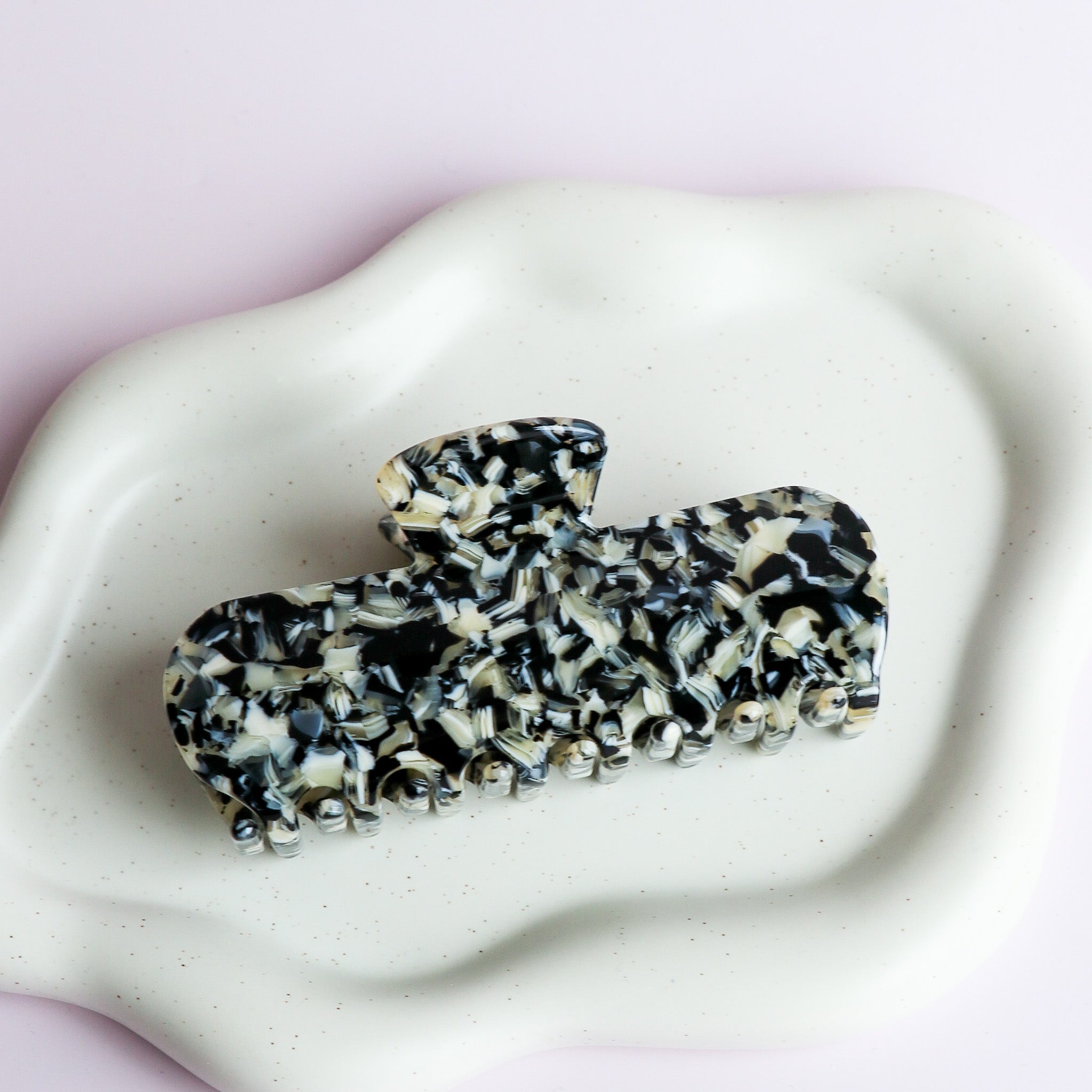 Pince à cheveux de forme rectangulaire aux coins arrondis. Parfaite pour les cheveux longs, en couette complète ou en demi-couette. Tombez sous le charme des motifs noirs, beiges et gris de cette pince.