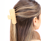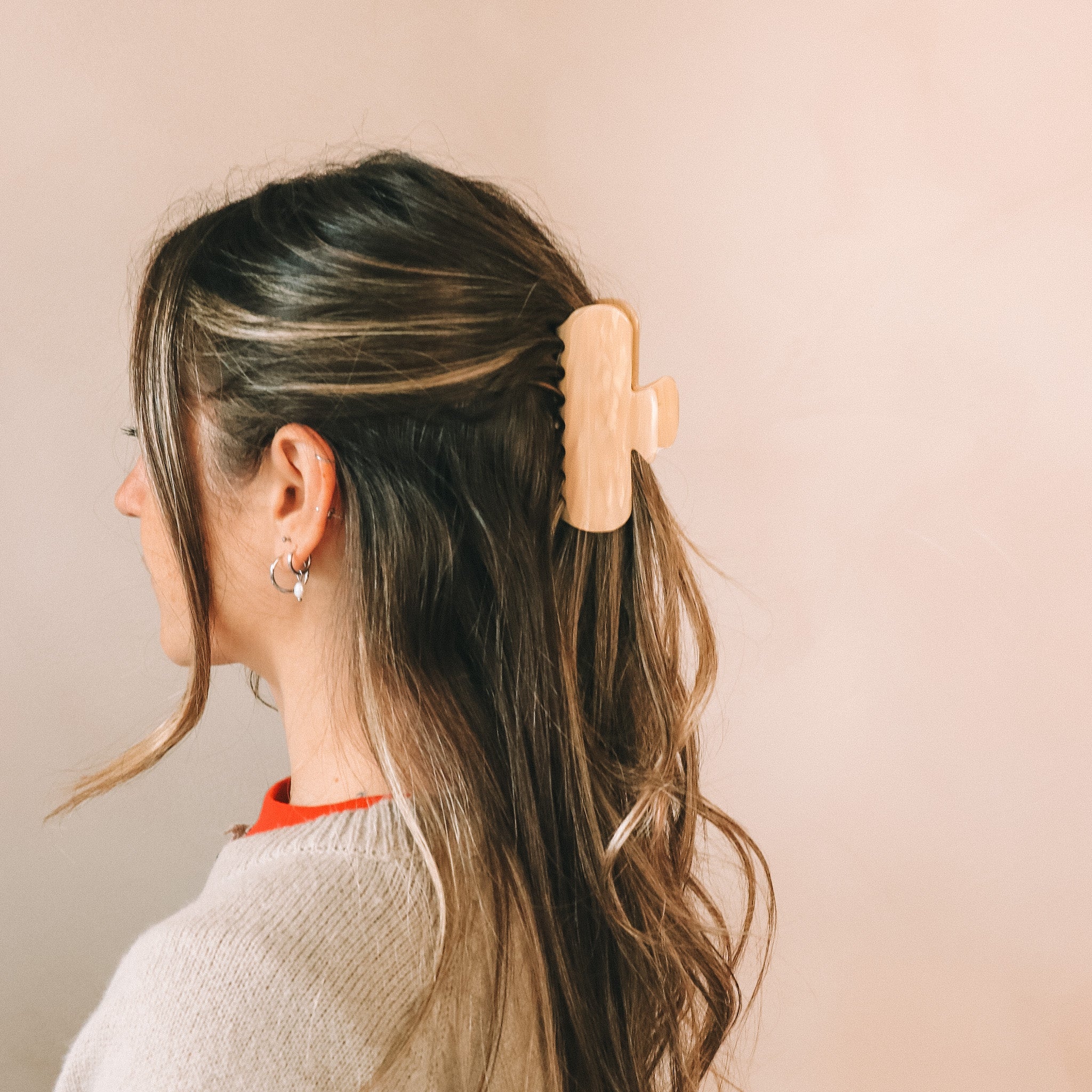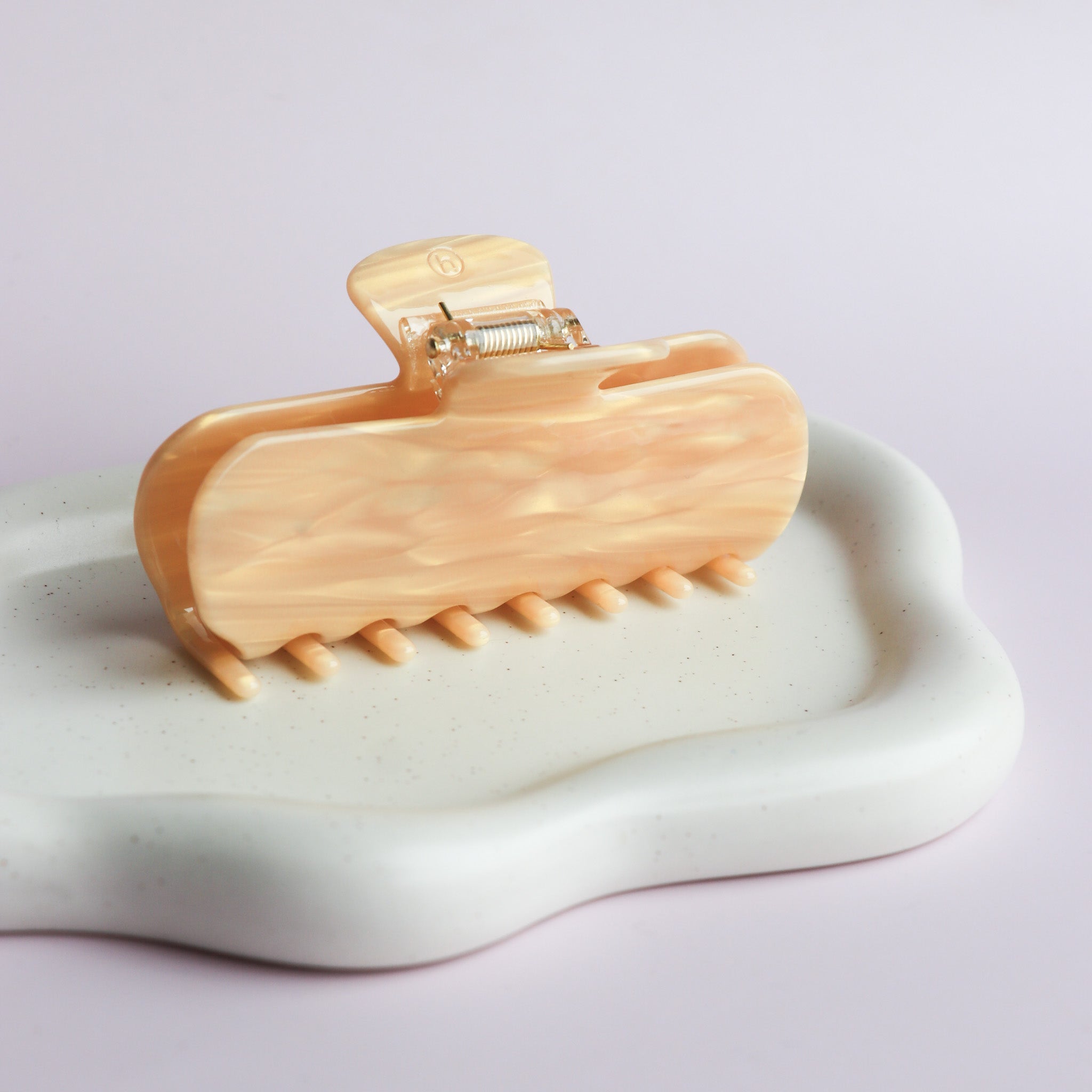 Pince à cheveux de forme rectangulaire aux coins arrondis. Parfaite pour les cheveux longs, en couette complète ou en demi-couette. De couleur pêche, beige et nacre.