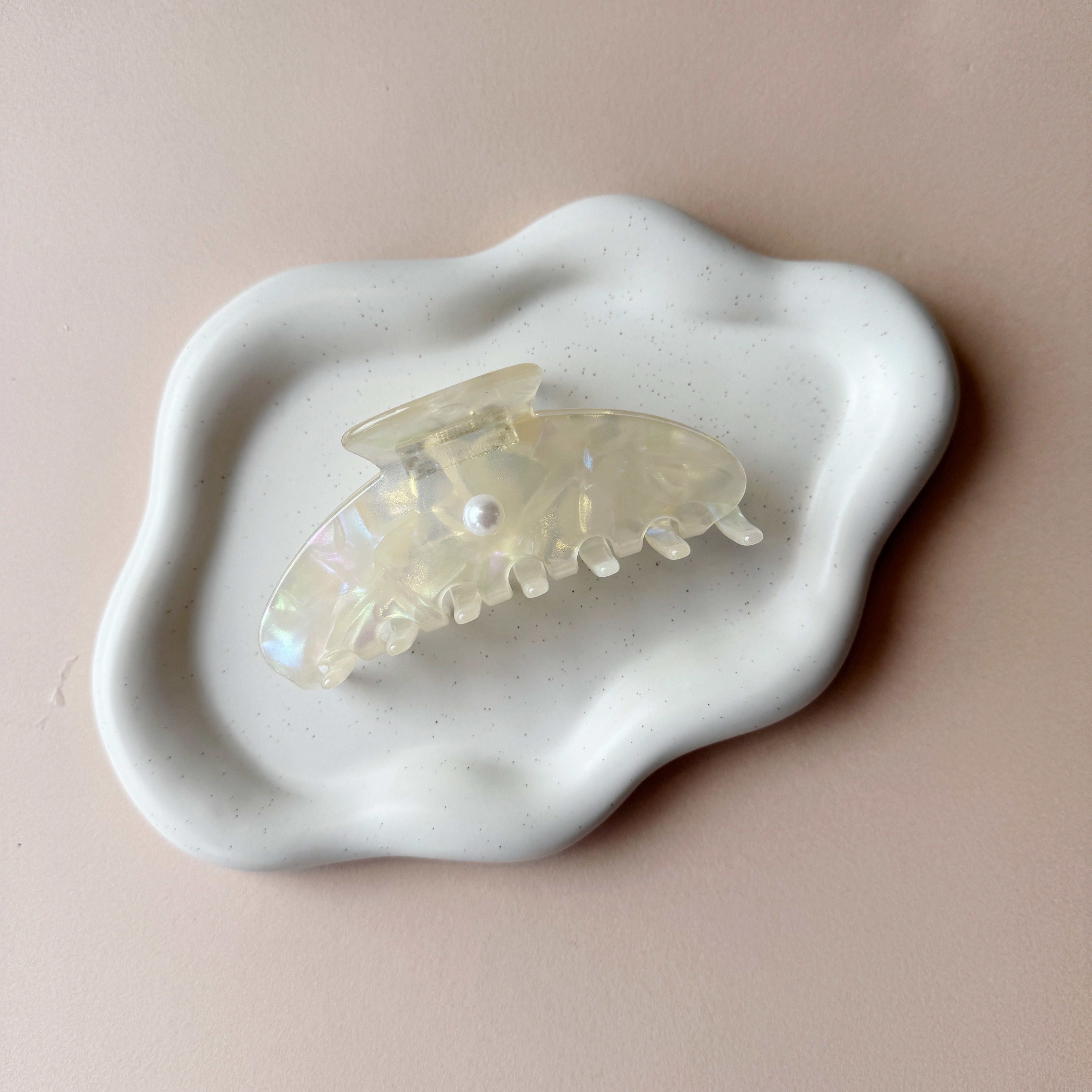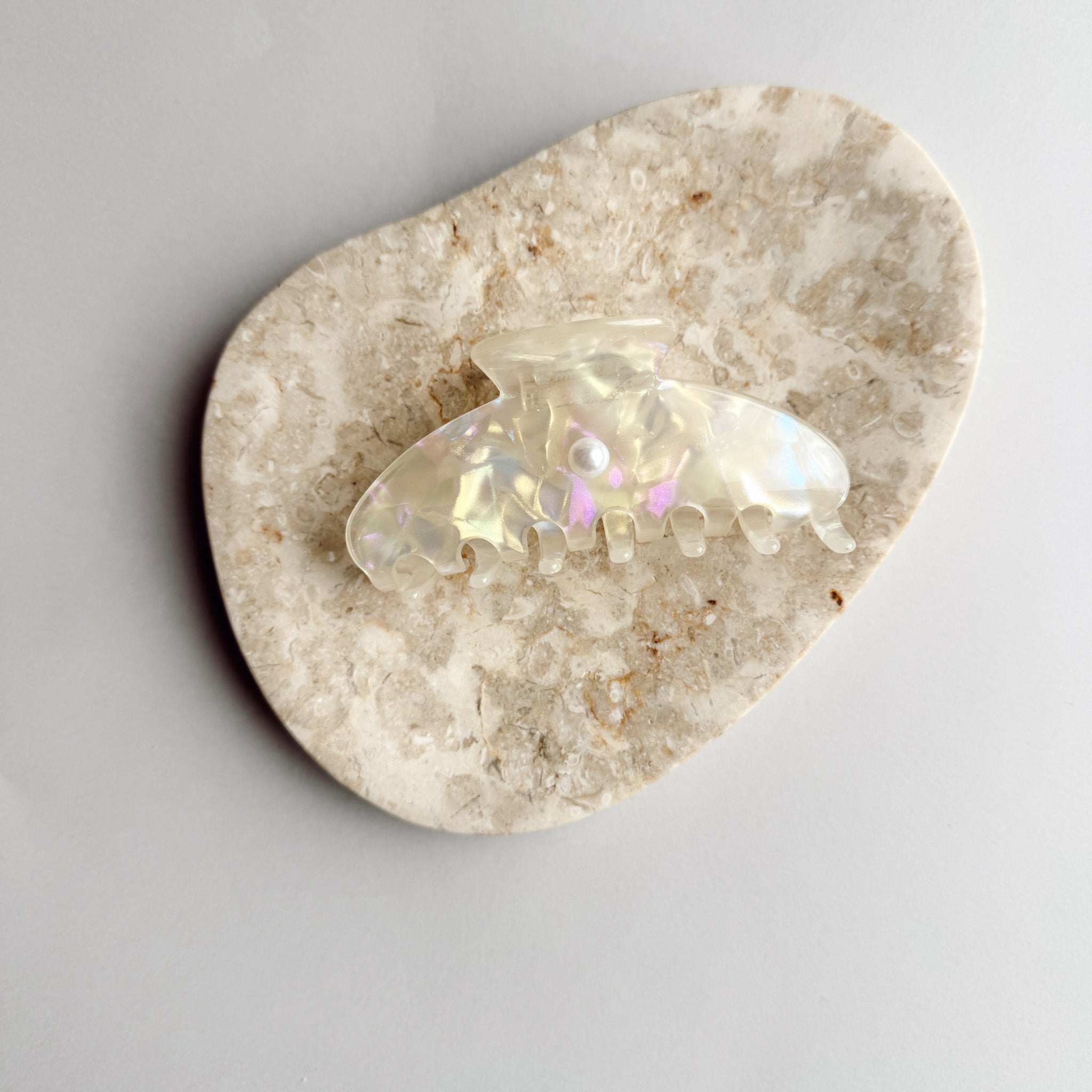 Pince à cheveux de couleur nacrée avec perle incrustée. Elle saura tenir en place tous les types de cheveux.
