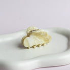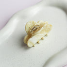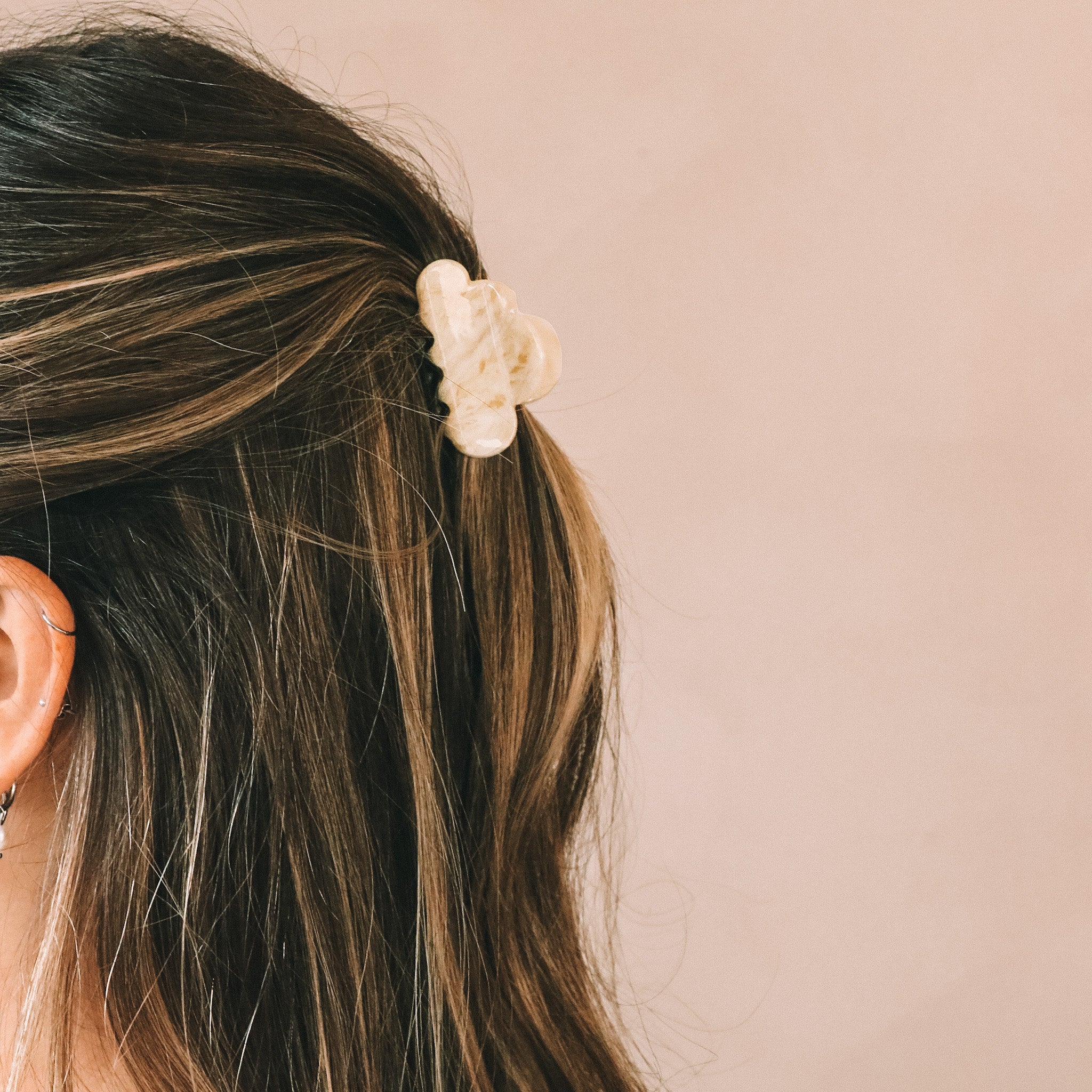 Pince à cheveux en forme de petit nuage. Idéale pour cheveux fins ou les demi-couette. Elle est originale et colorée dans un motif marbré beige et crème.