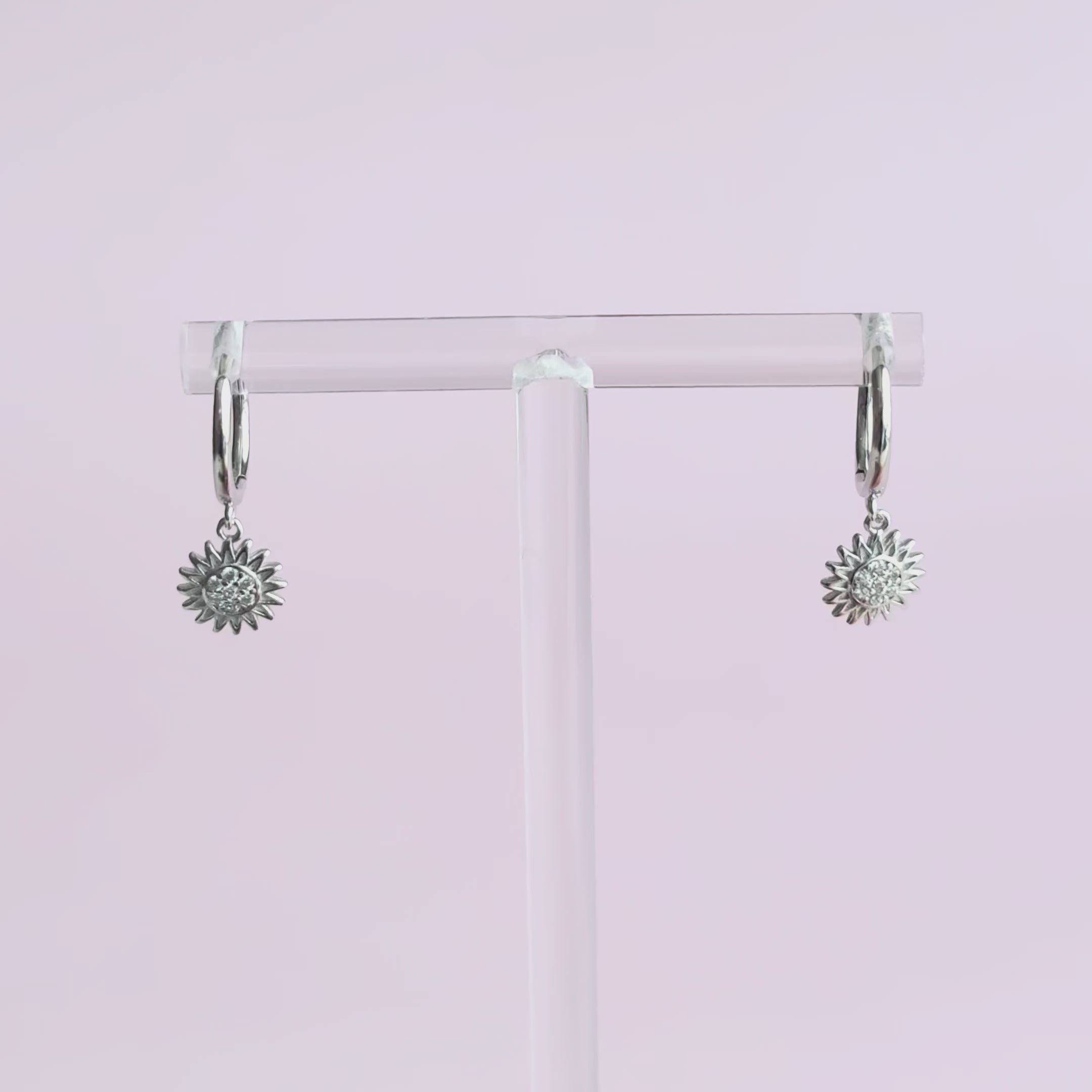 Boucles d'oreilles de type anneaux dormeuses avec breloque de fleur de tournesol incrustée de petits zircons.