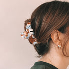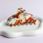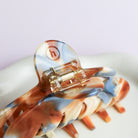 Pince à cheveux de forme arrondie aux teintes de bleu-gris, orange brulé et beige. La Agatha est solide et est capable de retenir les chevelures les plus denses.