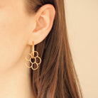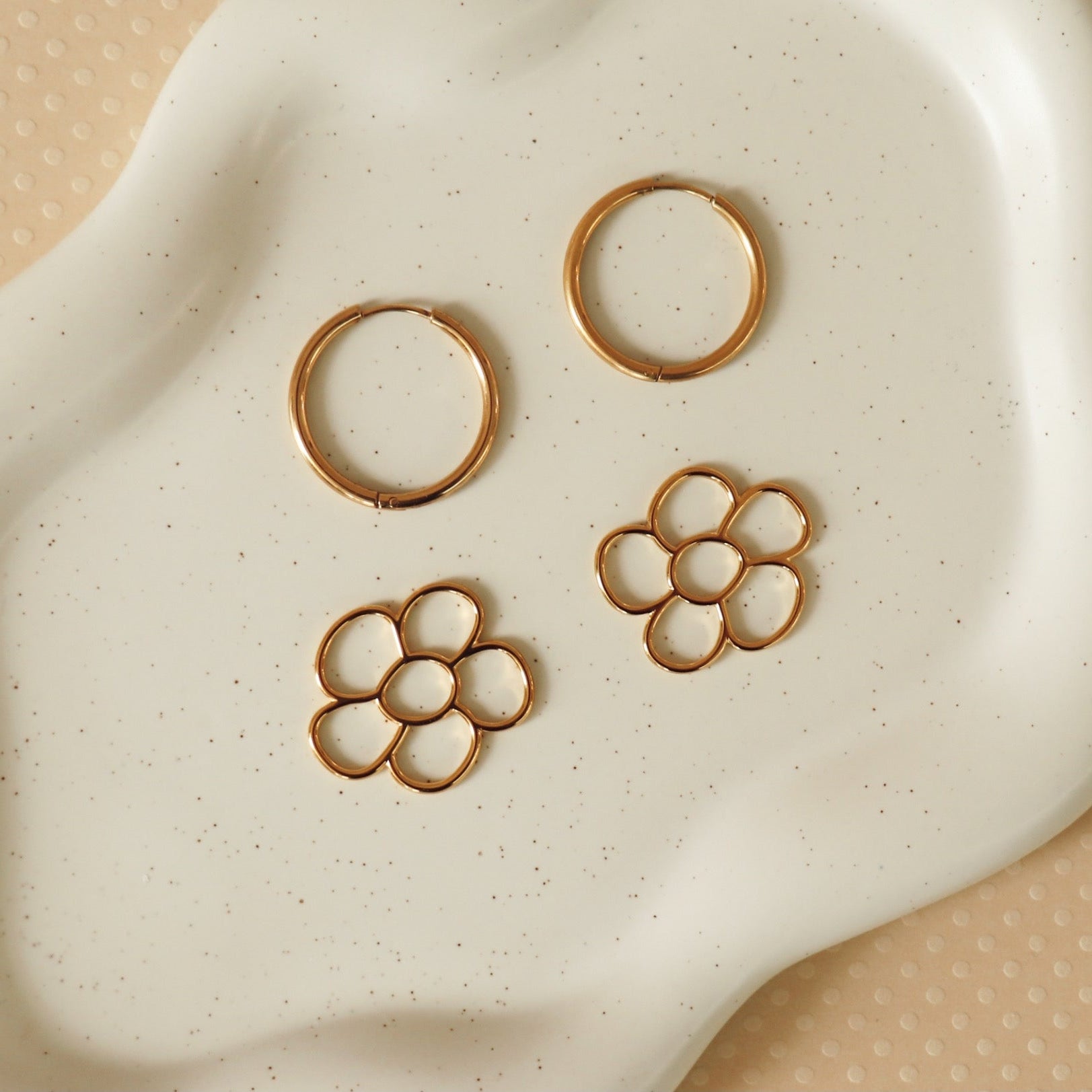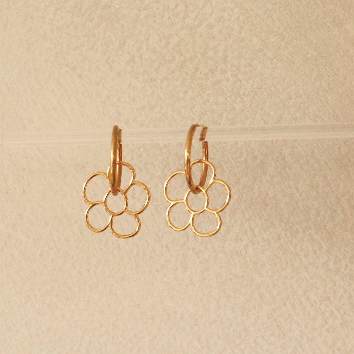 Boucles d'oreilles de type anneaux avec un pendentif en forme de fleur.