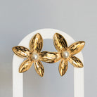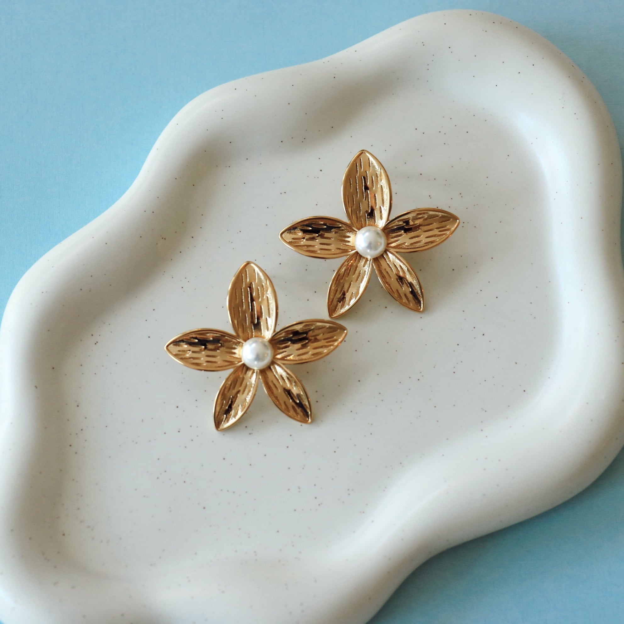 Boucles d'oreilles à tige (studs) en forme de fleurs avec perle au centre. Pétales avec détails gravés.