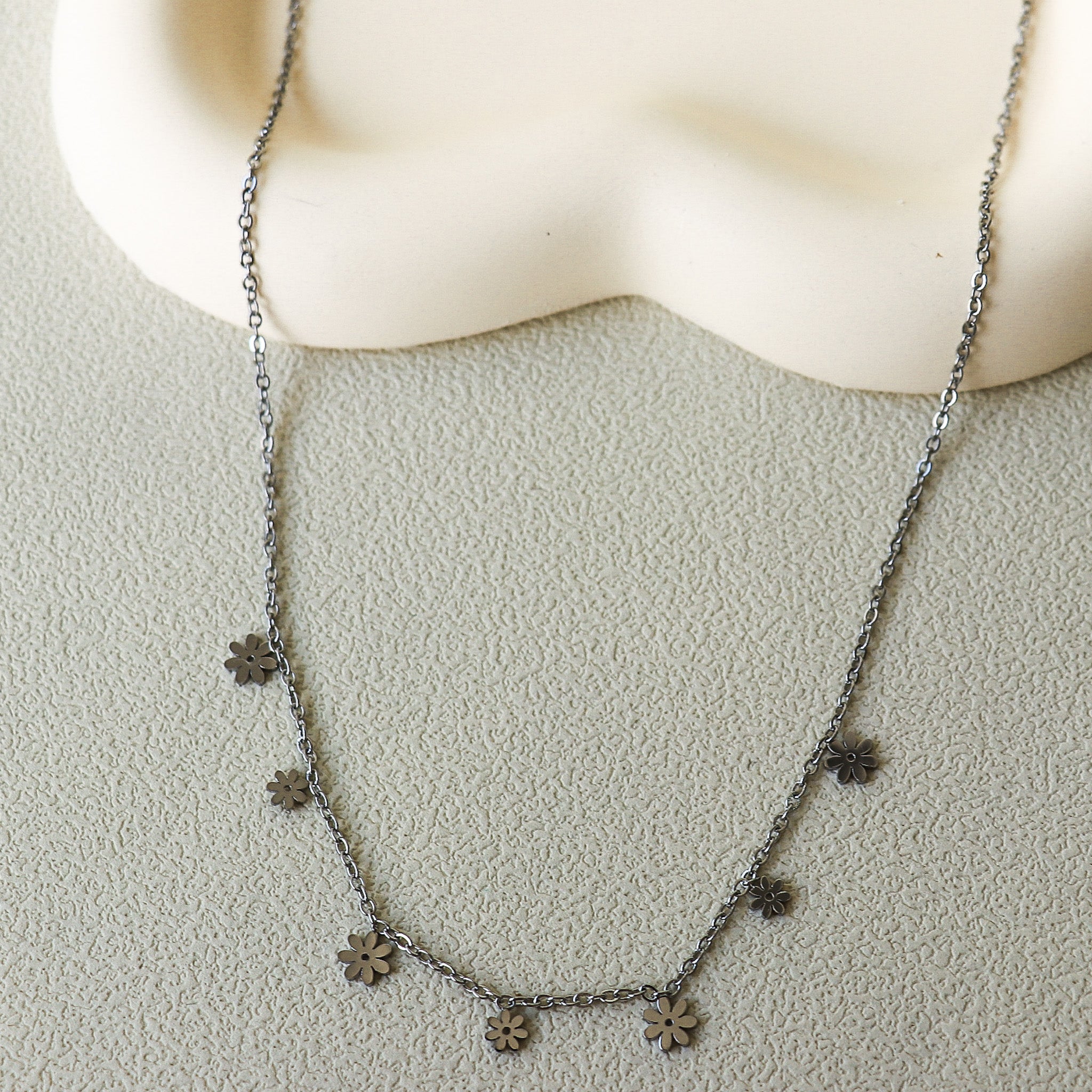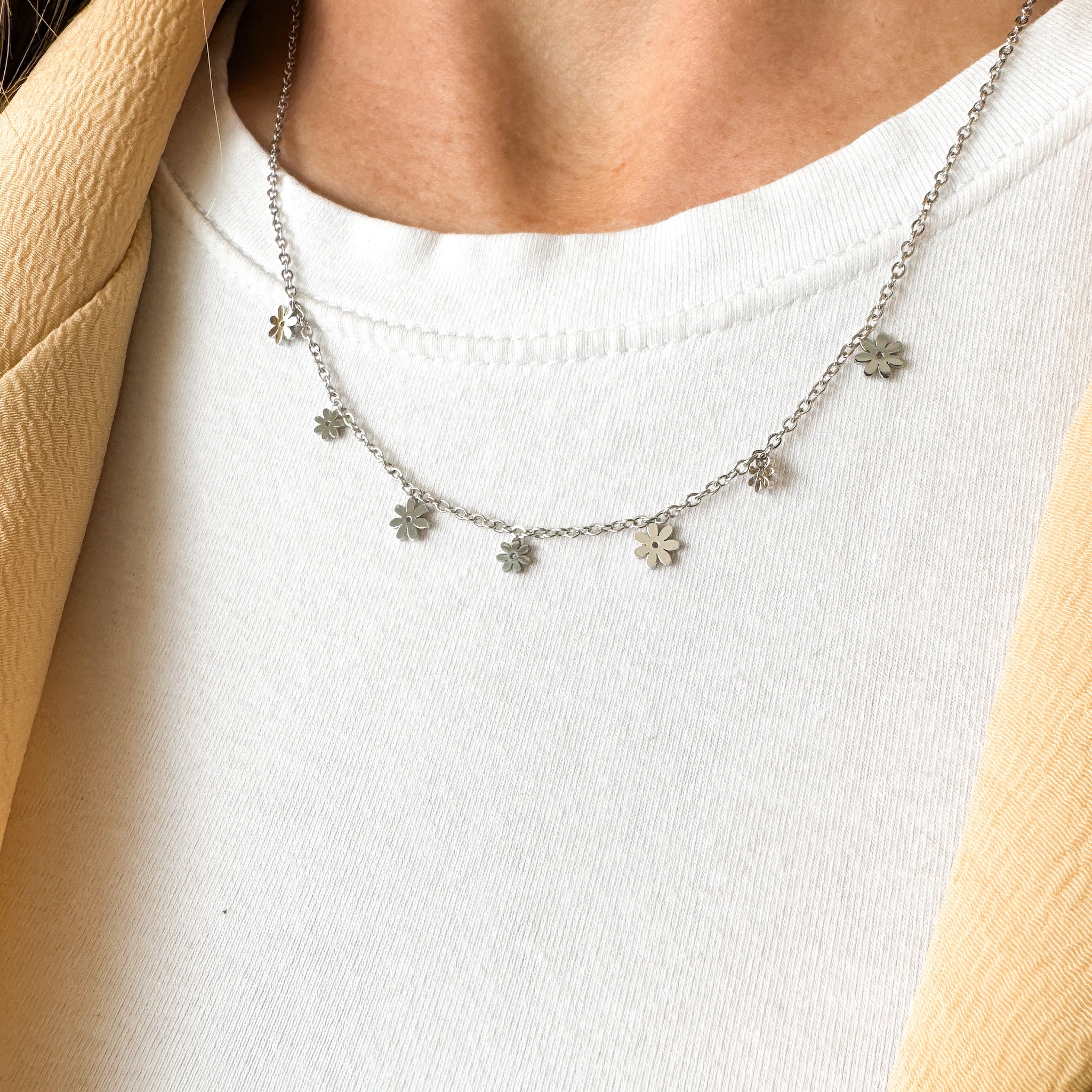 Collier délicat orné de sept petites fleurs de tailles variées. Résistant à l'eau, vous pourrez le porter en tout temps, sur le bord de la plage ou en pique-nique.