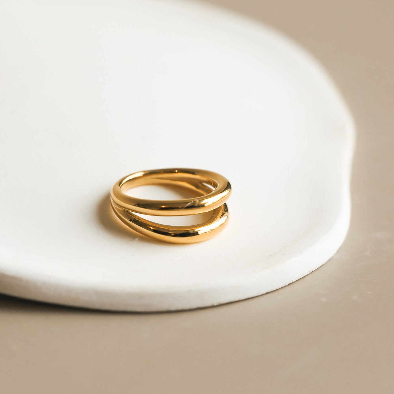 Bague à effet double comprenant deux jonc reliés. S'agence à merveille à toutes vos bagues et autre bijoux.