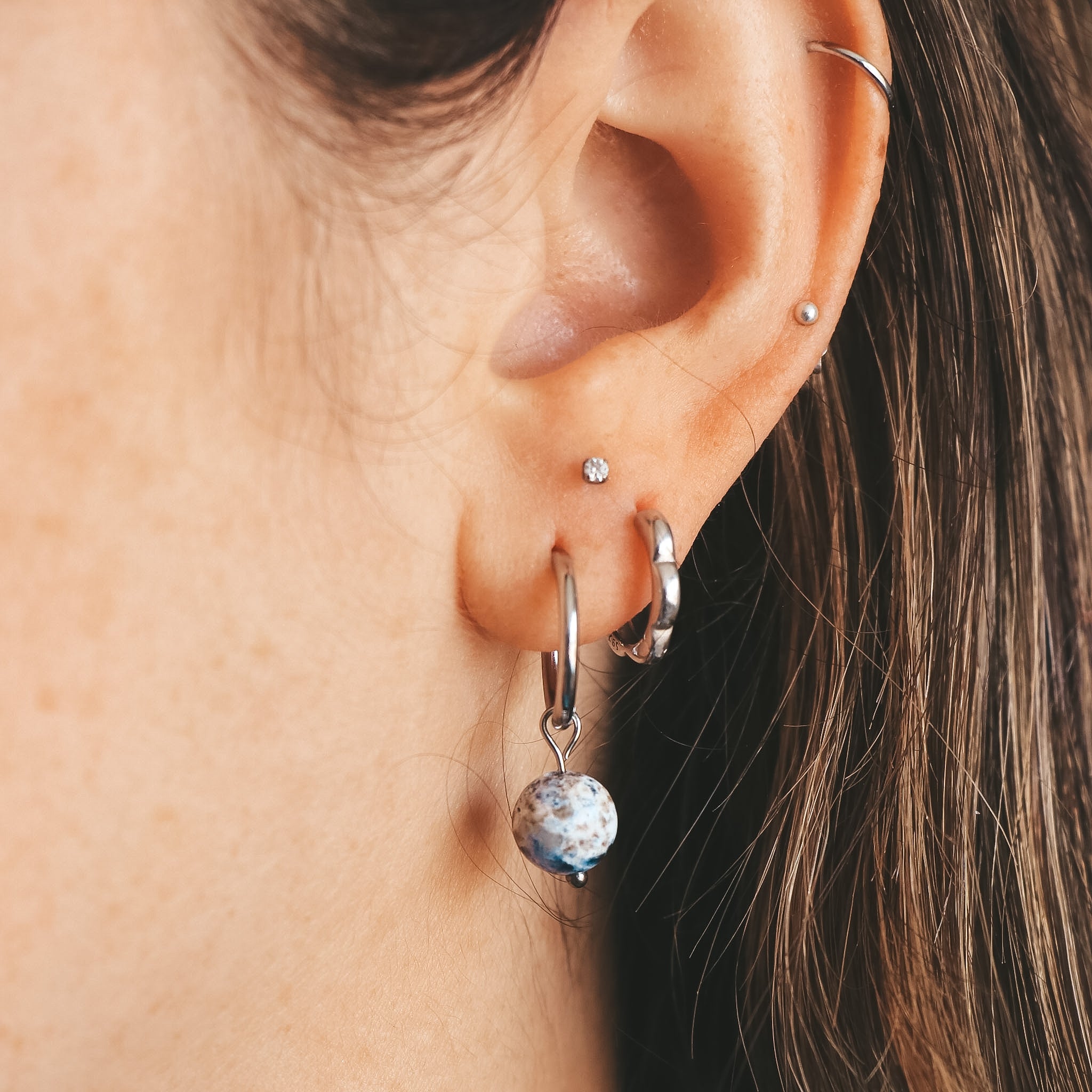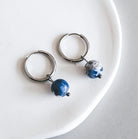 Boucles d'oreilles de type anneaux avec breloque ronde en pierre naturelle de couleur bleue et blanche.
