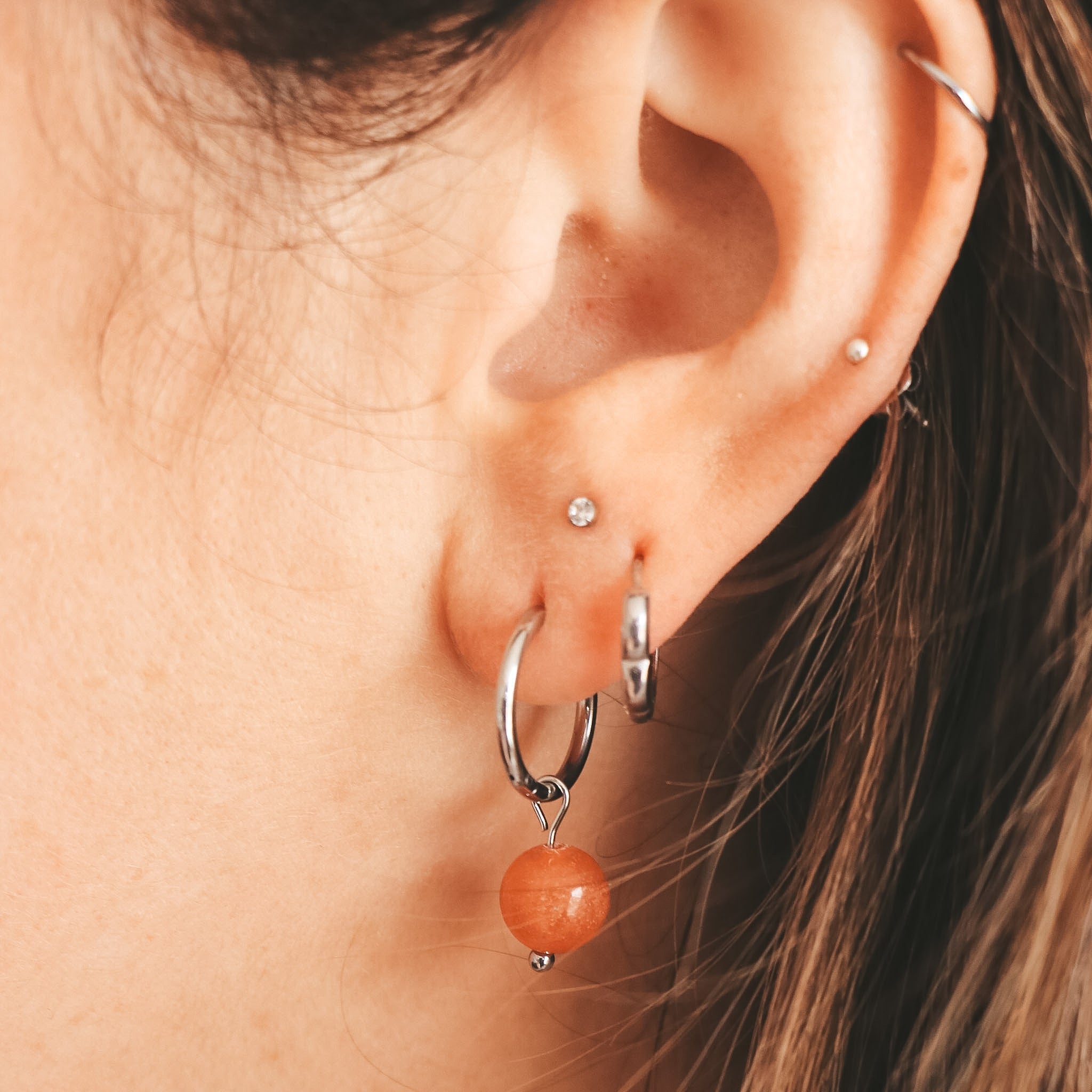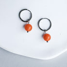 Boucles d'oreilles de type anneaux avec breloque ronde en pierre naturelle de couleur orange brûlé.