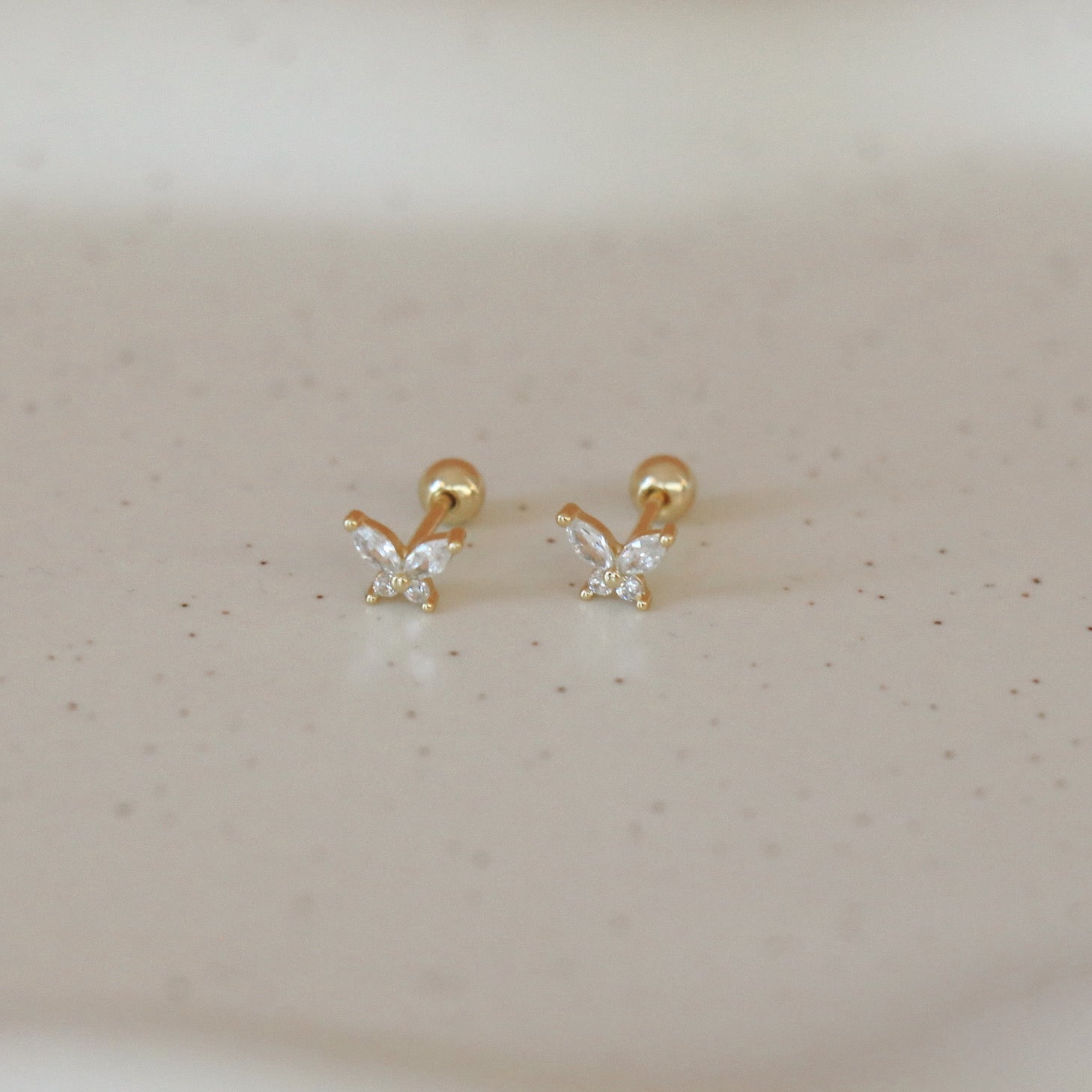 Boucles d'oreilles à tige avec petit papillon en zircons transparents. Fermeture avec bille à visser à l'arrière. Confortables et délicates, parfaites pour ajouter du brillant à vos oreilles.