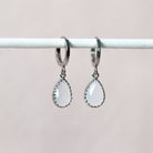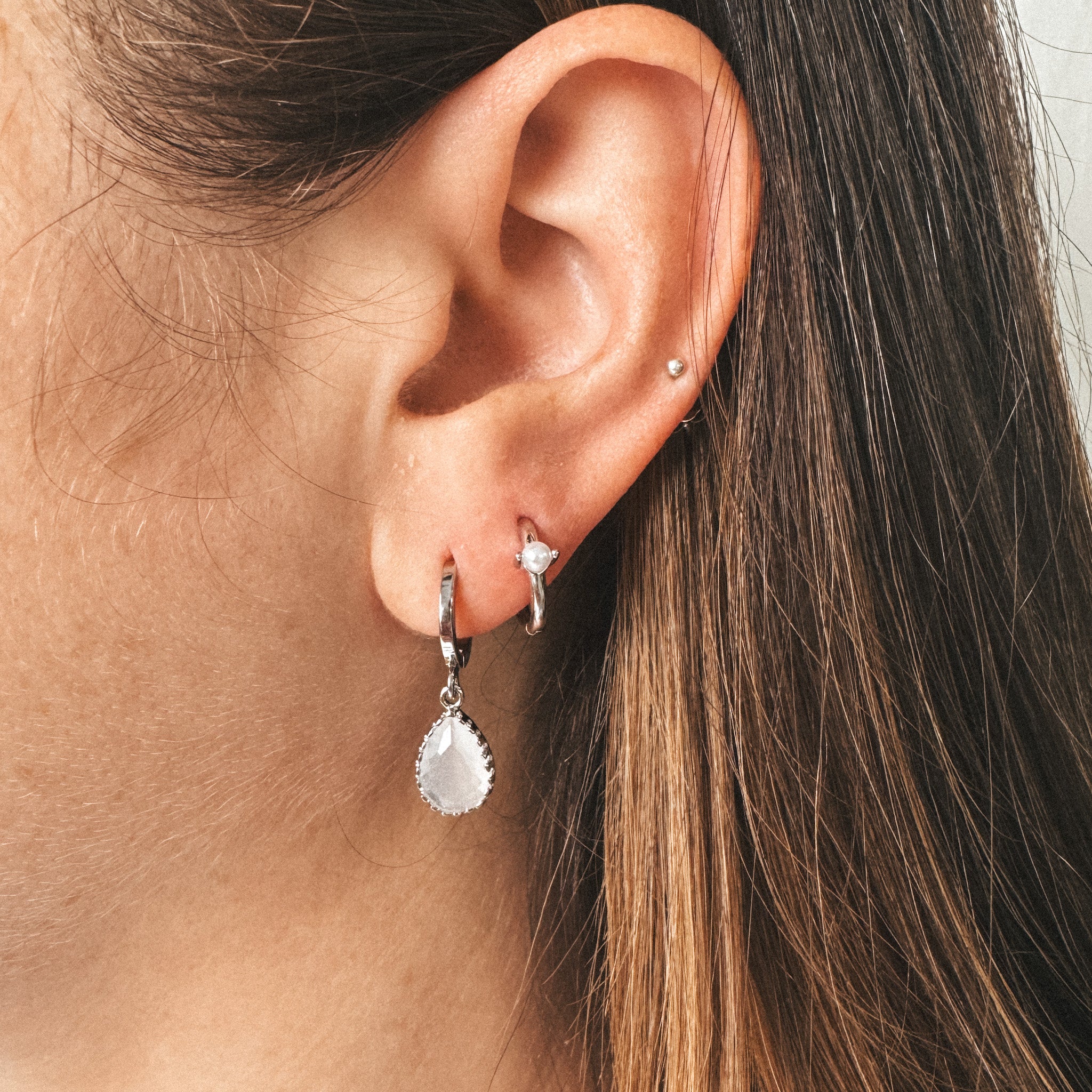 Boucles d'oreilles de type dormeuses ornées d'un pendentif en forme de goutte en pierre de verre couleur crème.