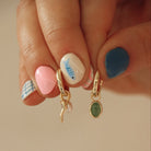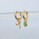 Boucles d'oreilles de type asymétriques à breloques. Elles sont composées de trois breloques: une pierre naturelle d'aventurine verte, une perle d'eau douce et un petit piment.