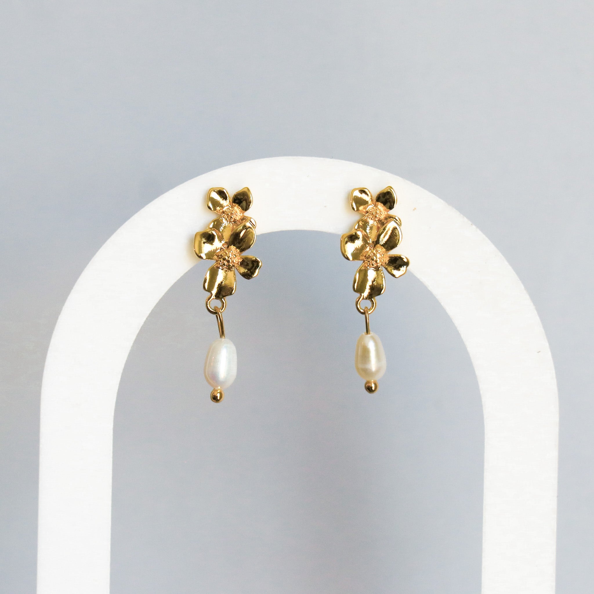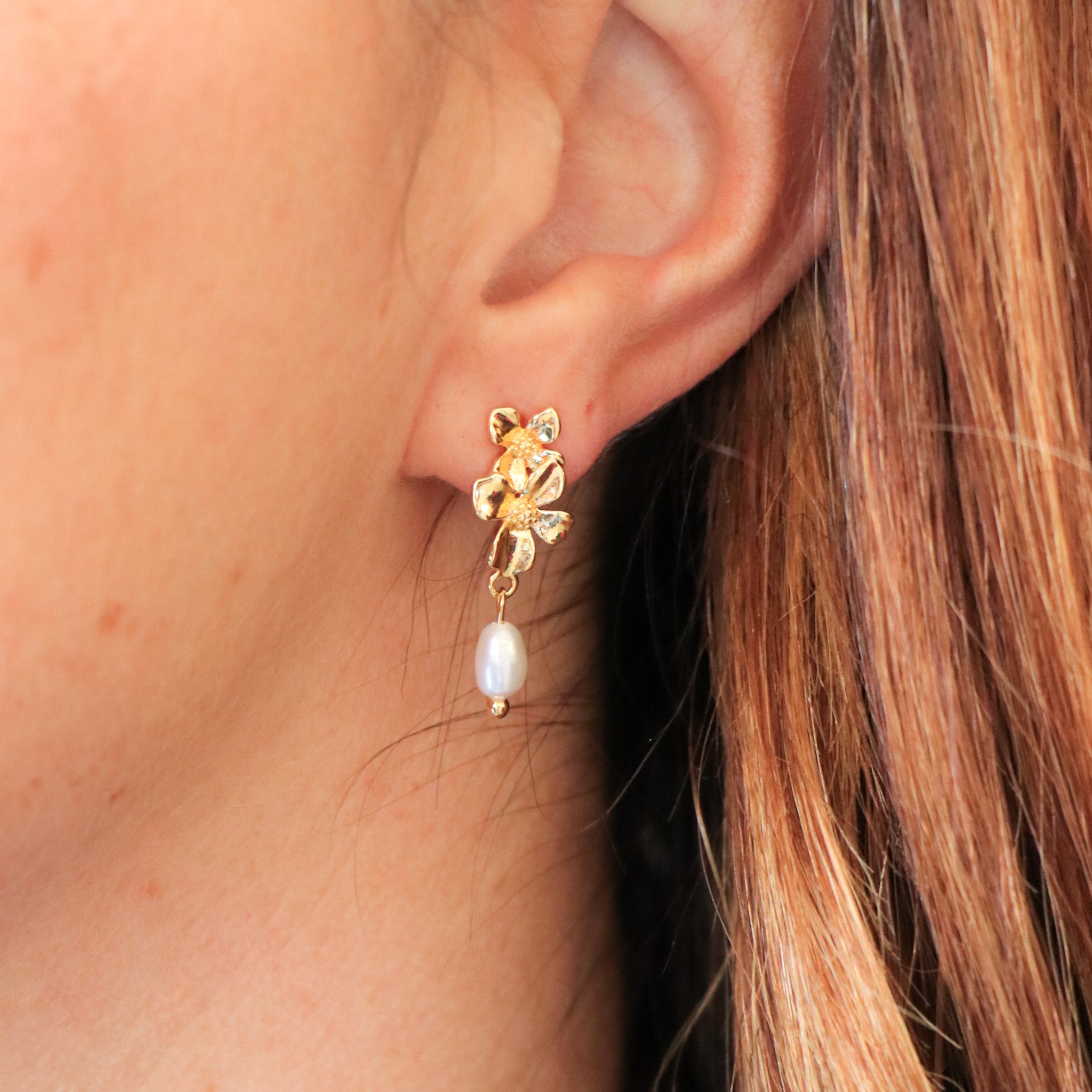 Boucles d'oreilles avec une tige composées de deux petites fleurs et une perle d'eau douce pendante.
