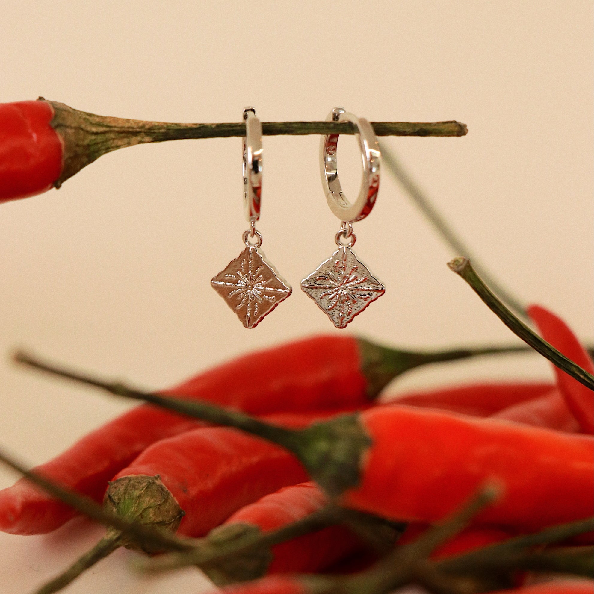 Boucles d'oreilles dessinées en collaboration avec l'artiste et tatoueuse Émilie Paré (@tatoueusee). Inspirées par les tuiles portugaises lors d'un récent voyage, vous retrouvez sur les breloques des lignes fines et contours festonnés. Ces délicates boucles d'oreilles sont à l'image de ses dessins et tatouages.