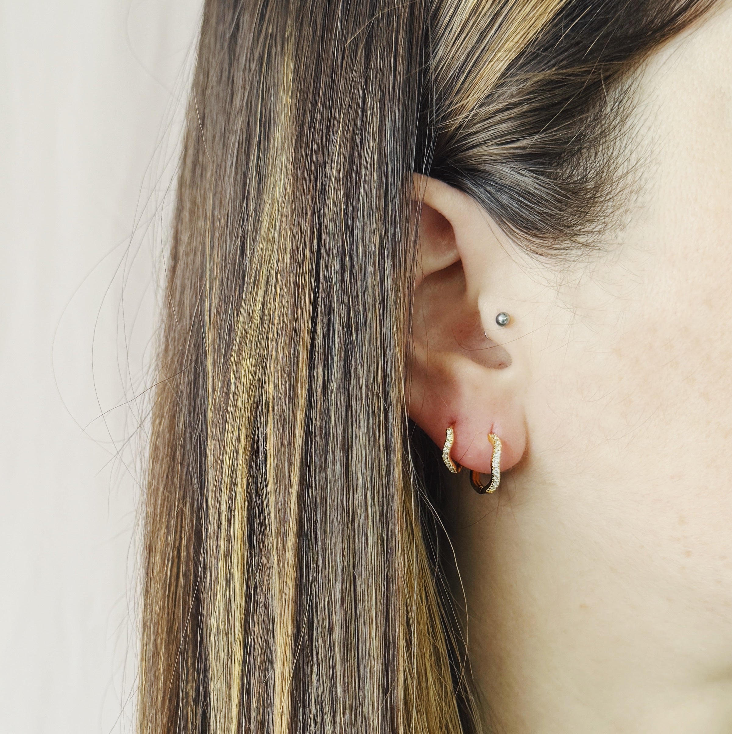 Boucles d'oreilles de type dormeuses. Ces petits anneaux ondulés sont la taille parfaite pour porter à vos deuxièmes trous de lobes pour un stack parfait! Sertis de petits zircons, ils ajouteront brillance et originalité à vos oreilles.
