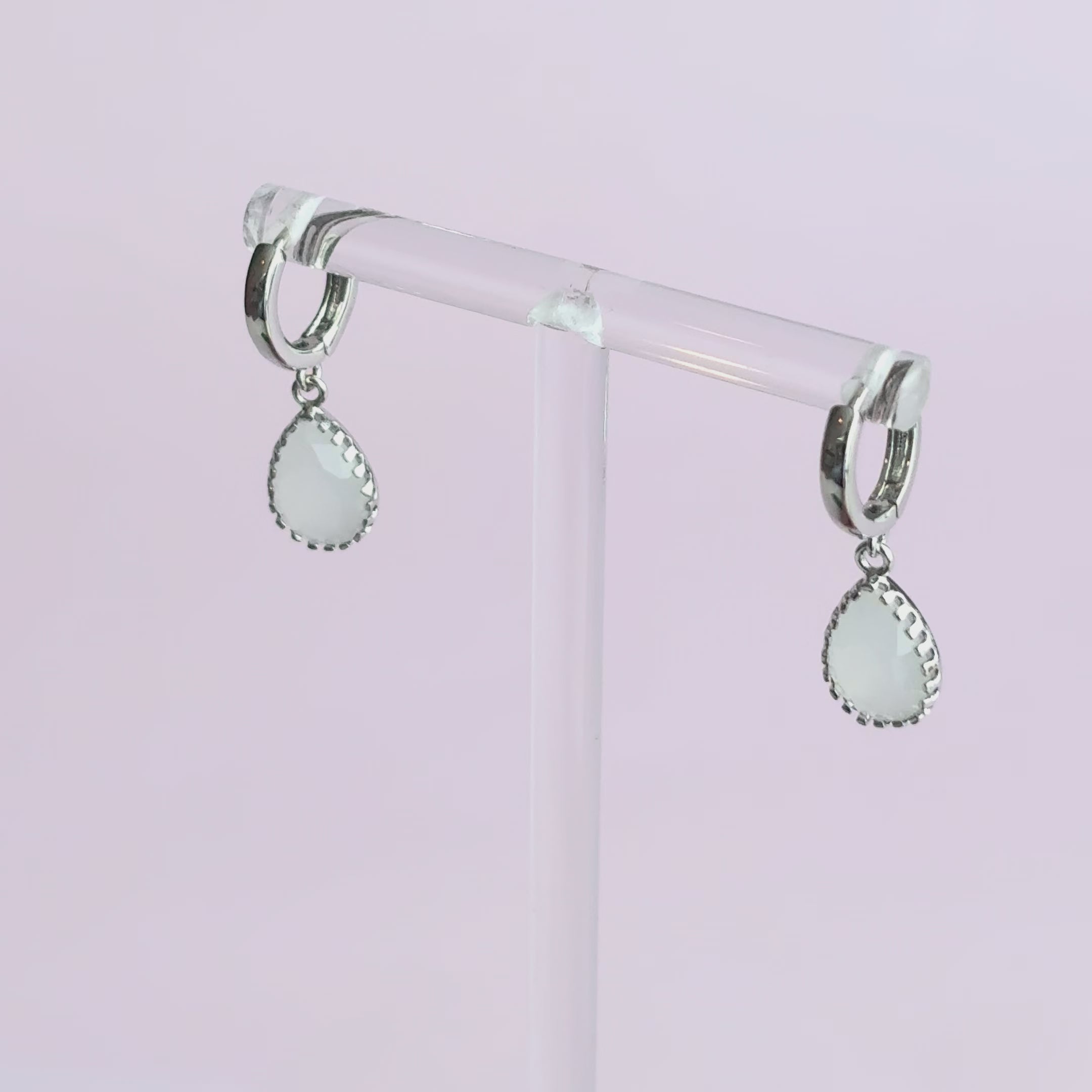 Boucles d'oreilles de type dormeuses ornées d'un pendentif en forme de goutte en pierre de verre couleur crème.