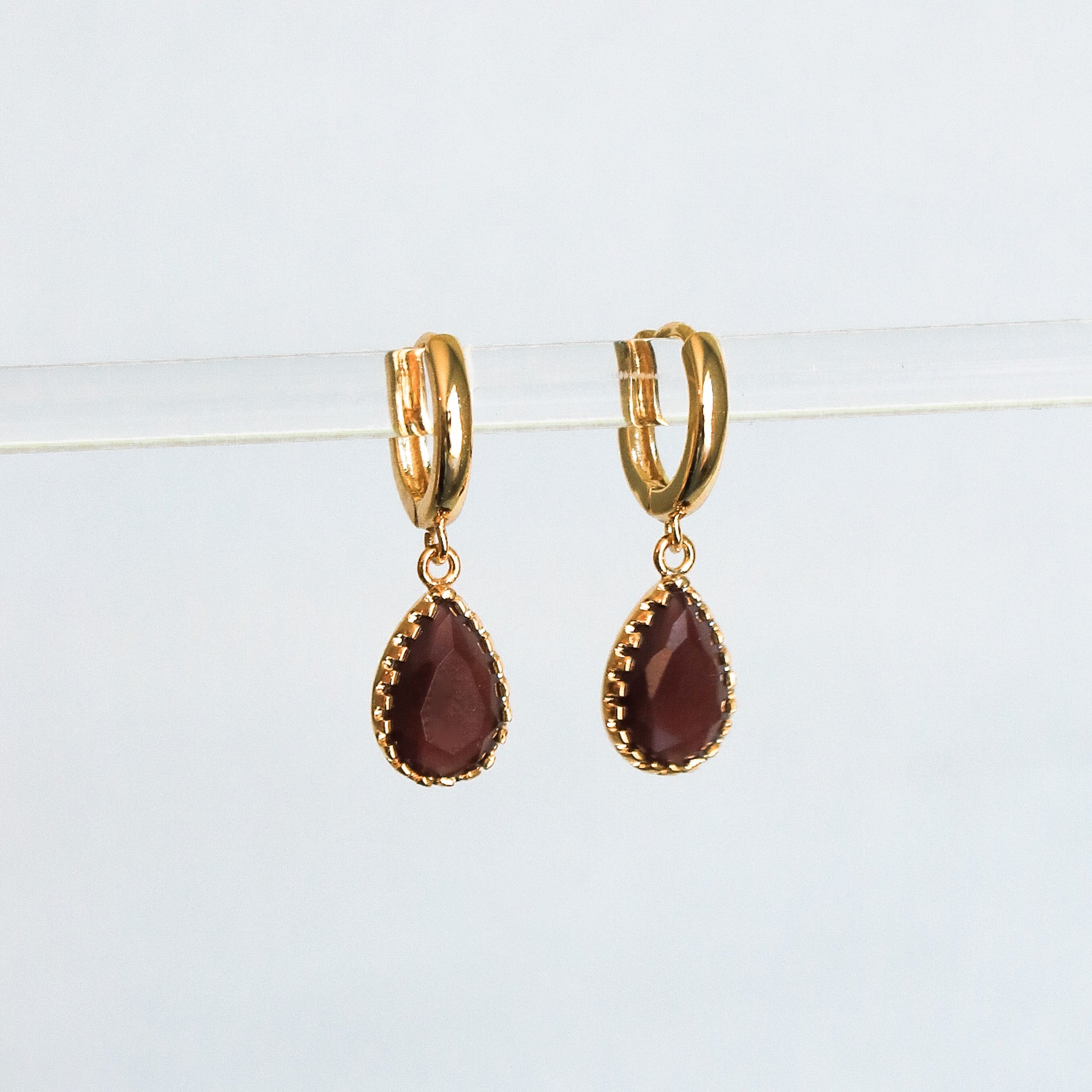 Boucles d'oreilles de type dormeuses ornées d'un pendentif en forme de goutte en pierre de verre couleur bordeaux.