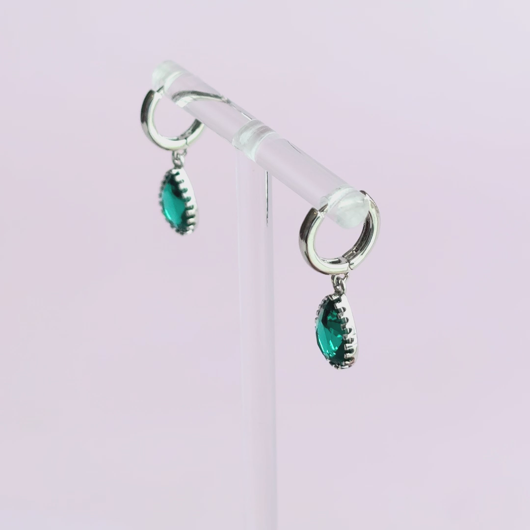 Boucles d'oreilles de type dormeuses ornées d'un pendentif en forme de goutte en pierre de verre couleur émeraude.