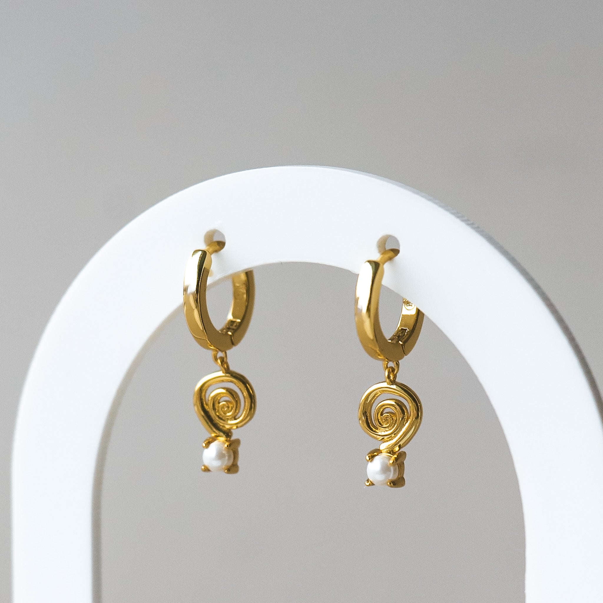 Boucles d'oreilles de type anneaux avec pendentif composé d'une forme de spirale et d'une petite perle.