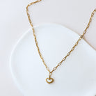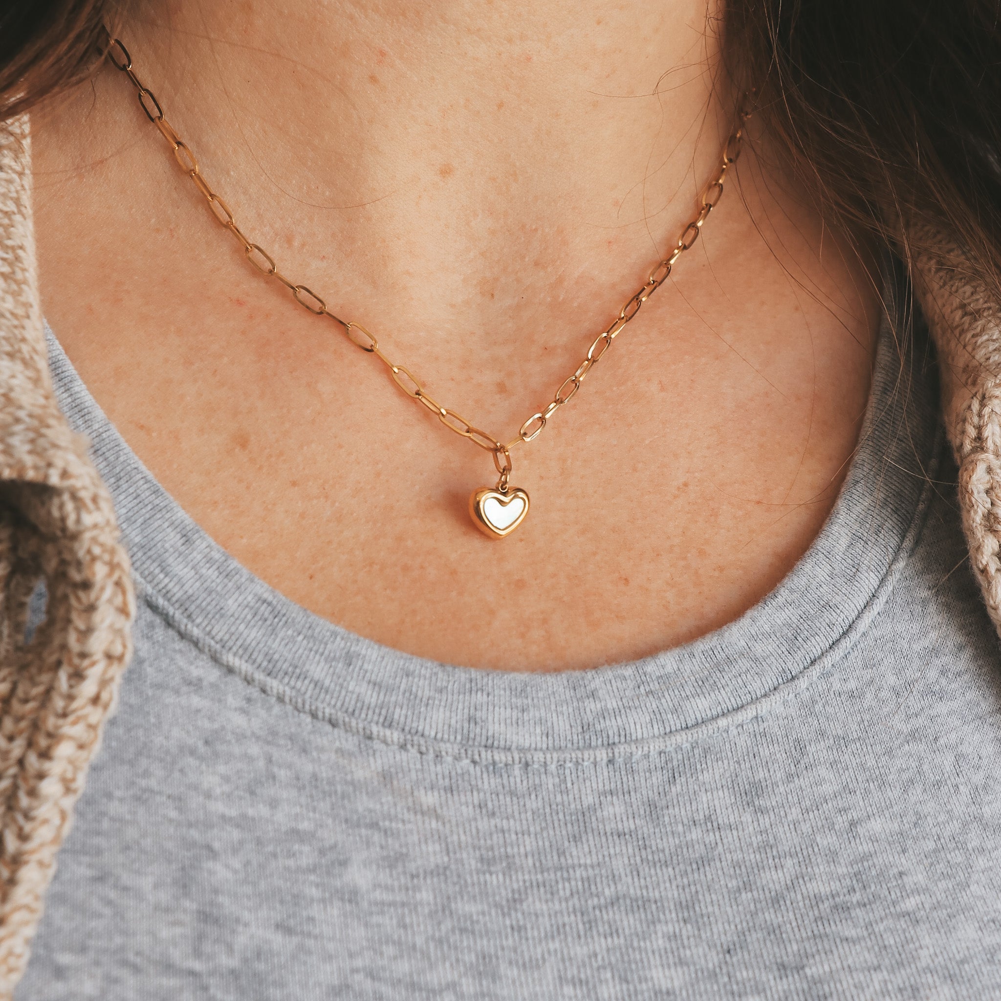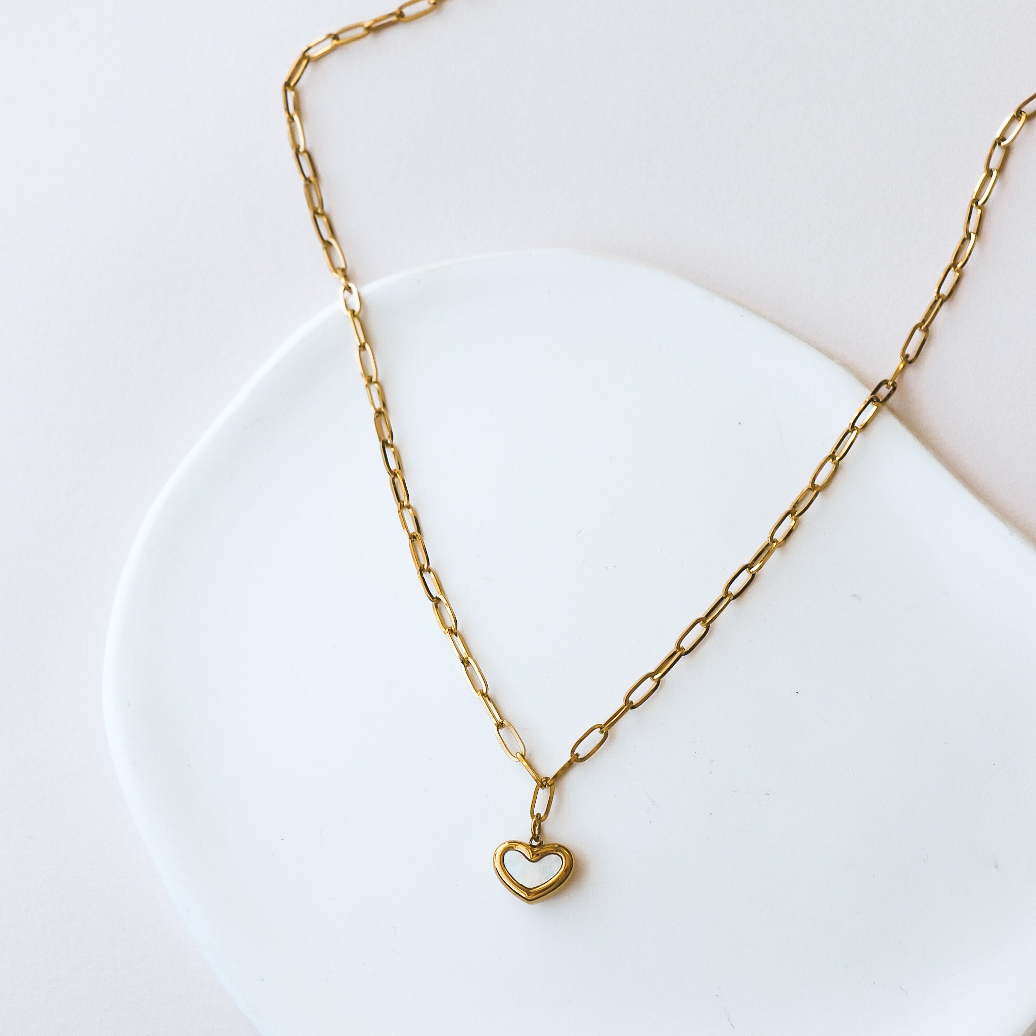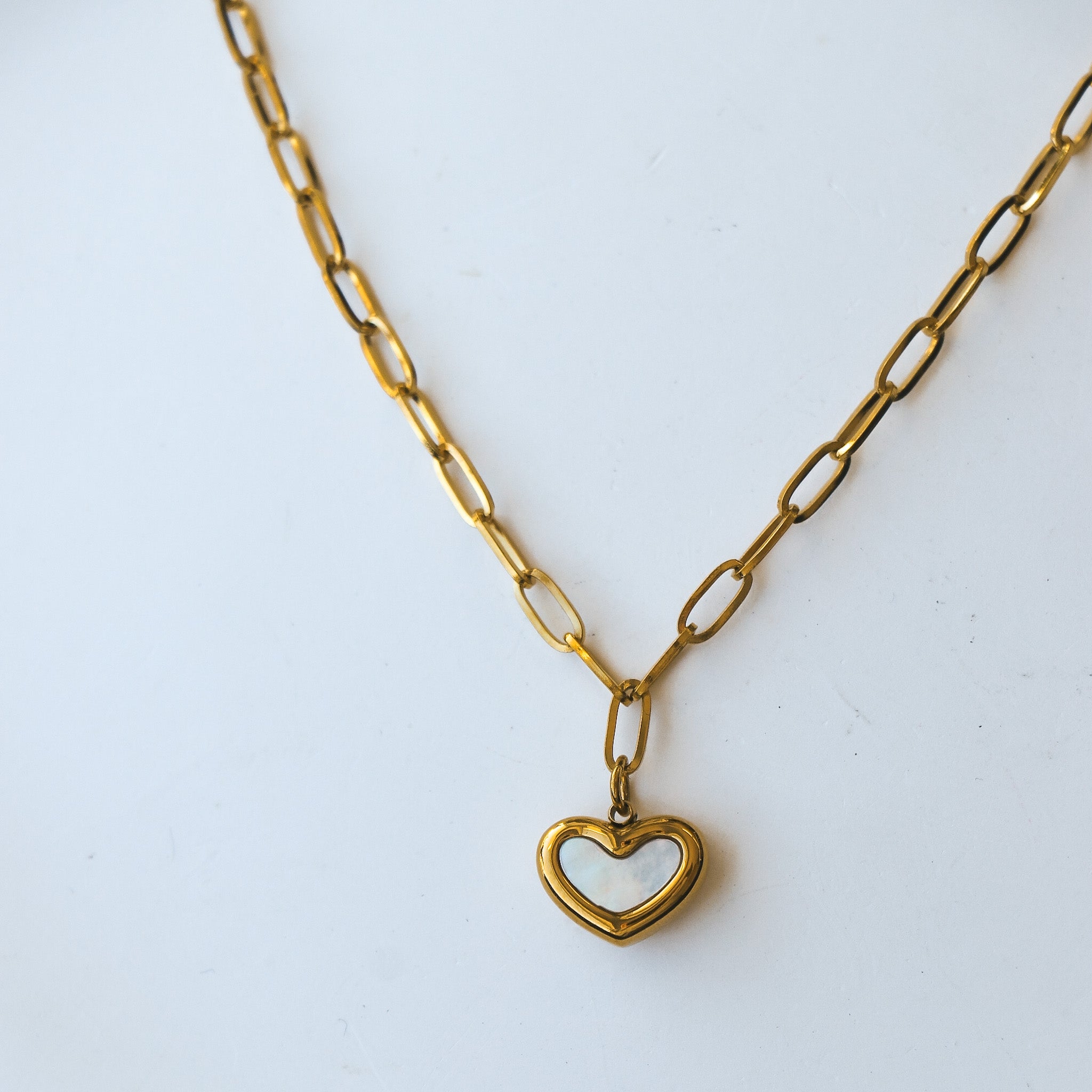 Collier composé d'une chaîne à mailles ovales avec un pendentif en forme de coeur et nacre en son centre.