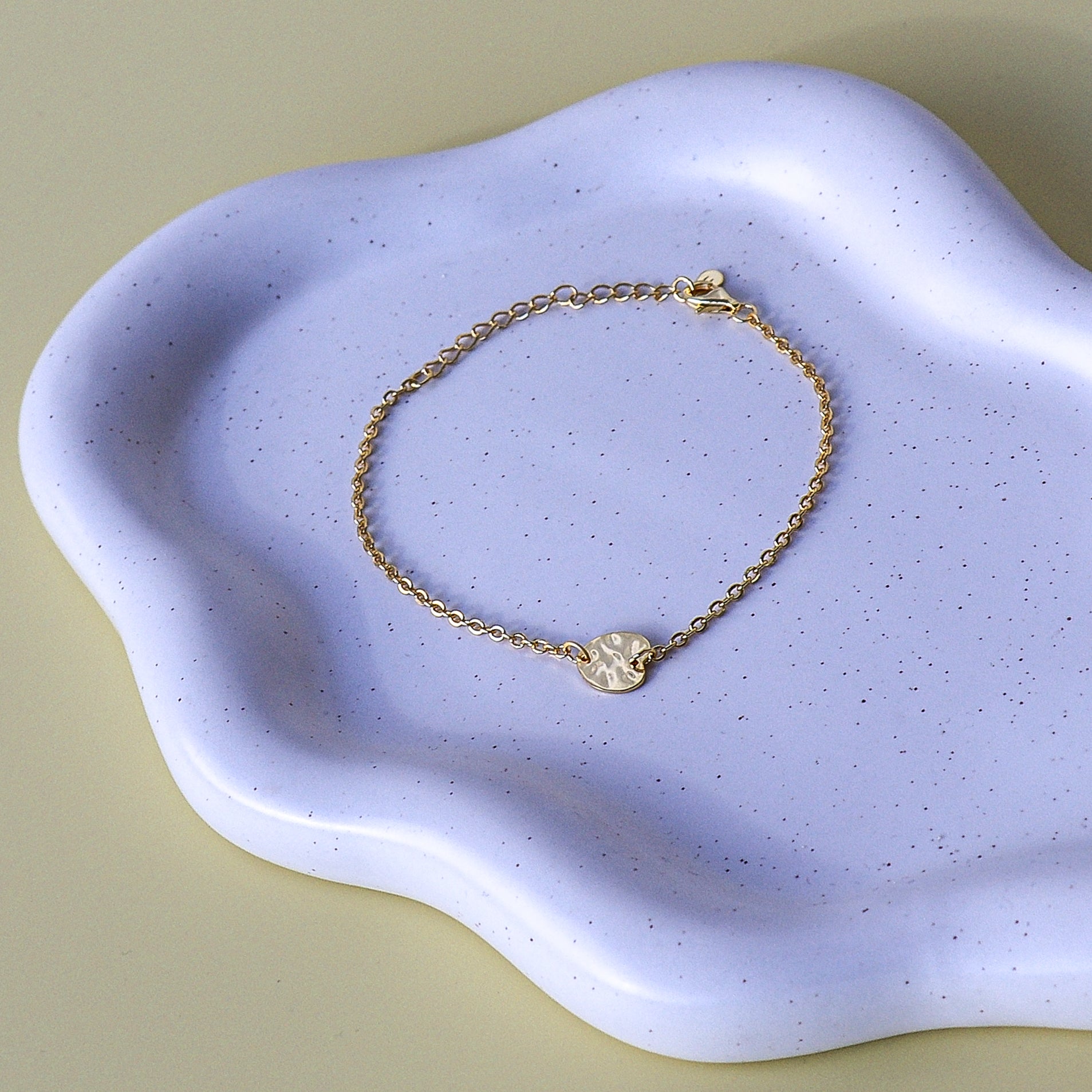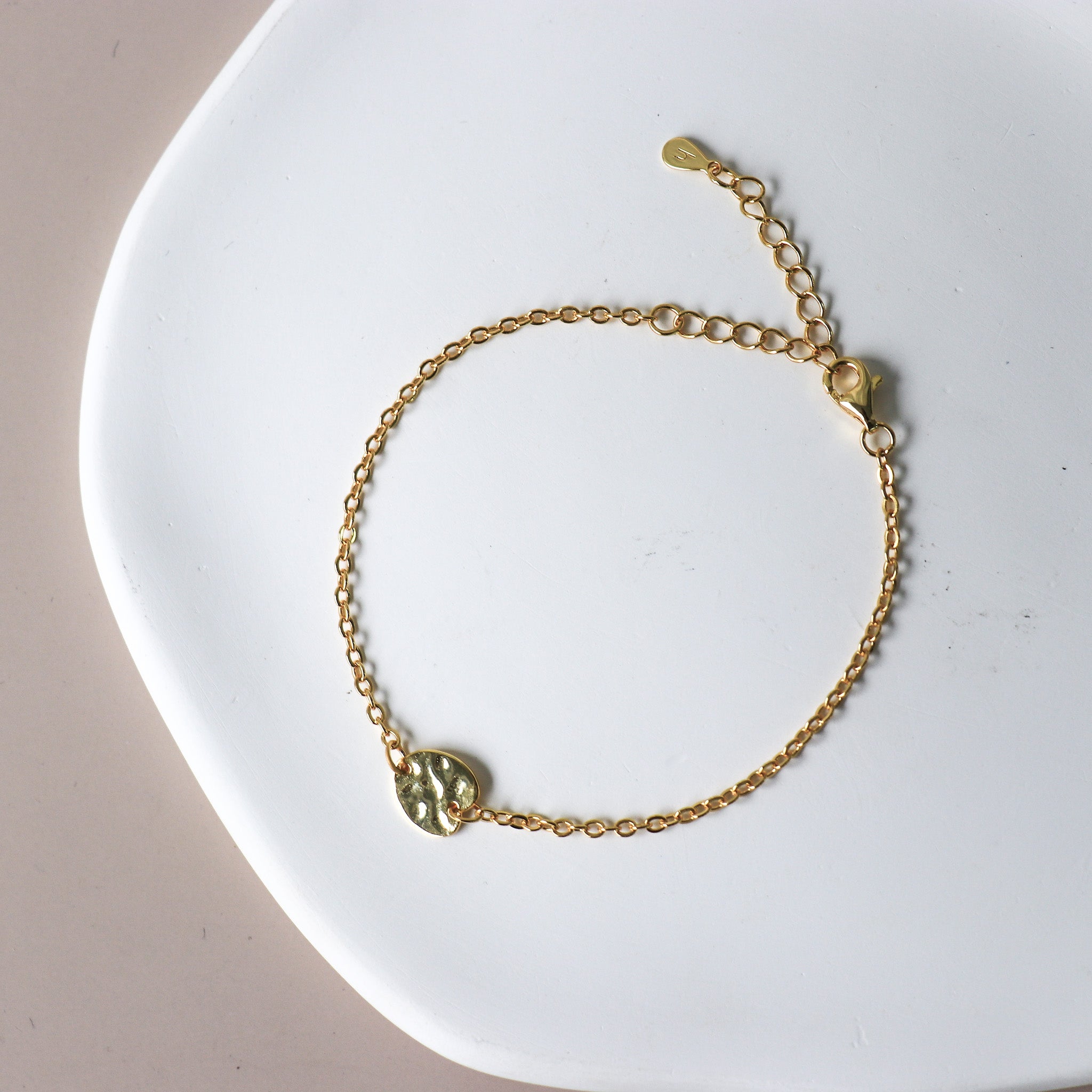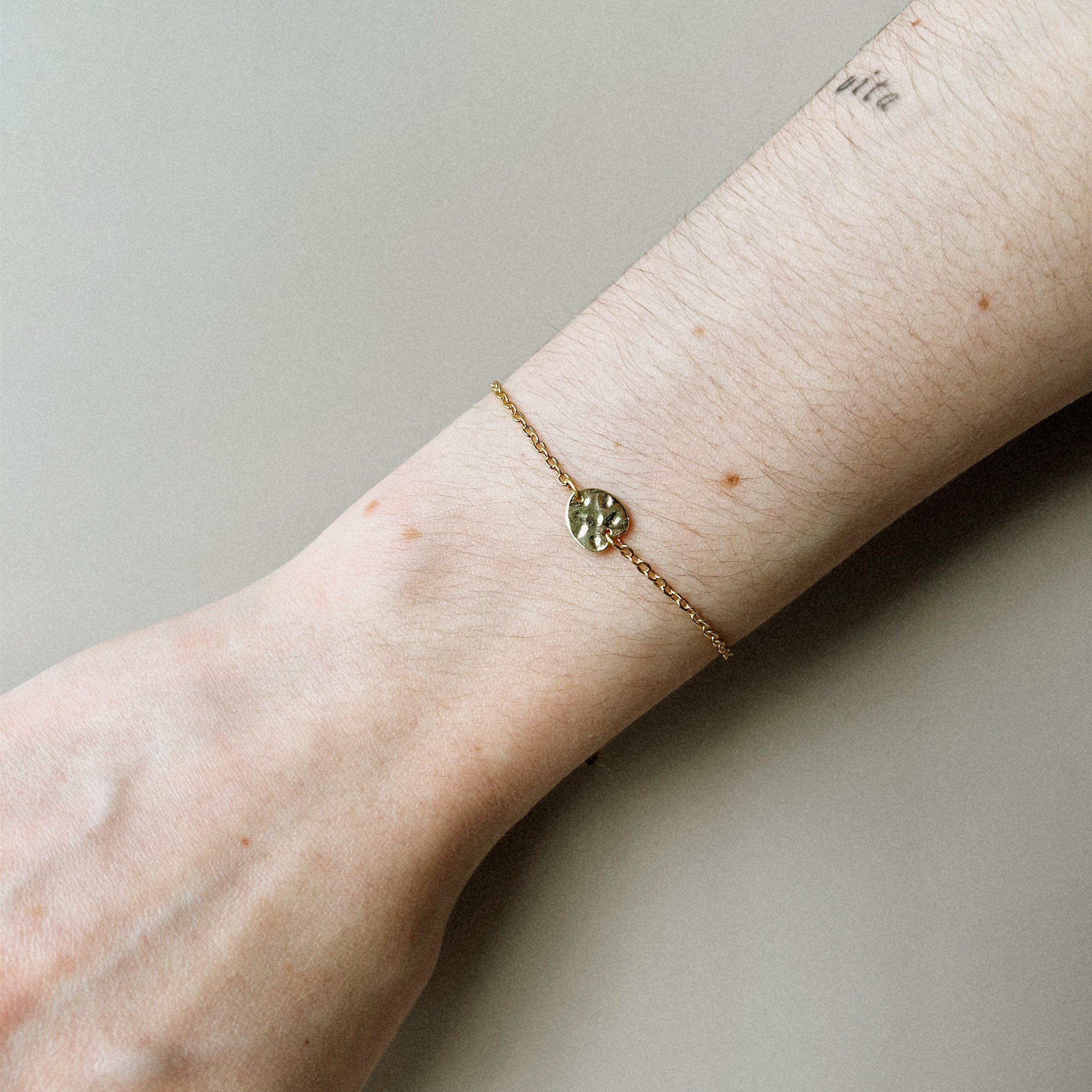 Bracelet en chaîne avec médaillon légèrement martelé en son centre. Un classique si se porte seul ou encore avec d'autres bracelets.