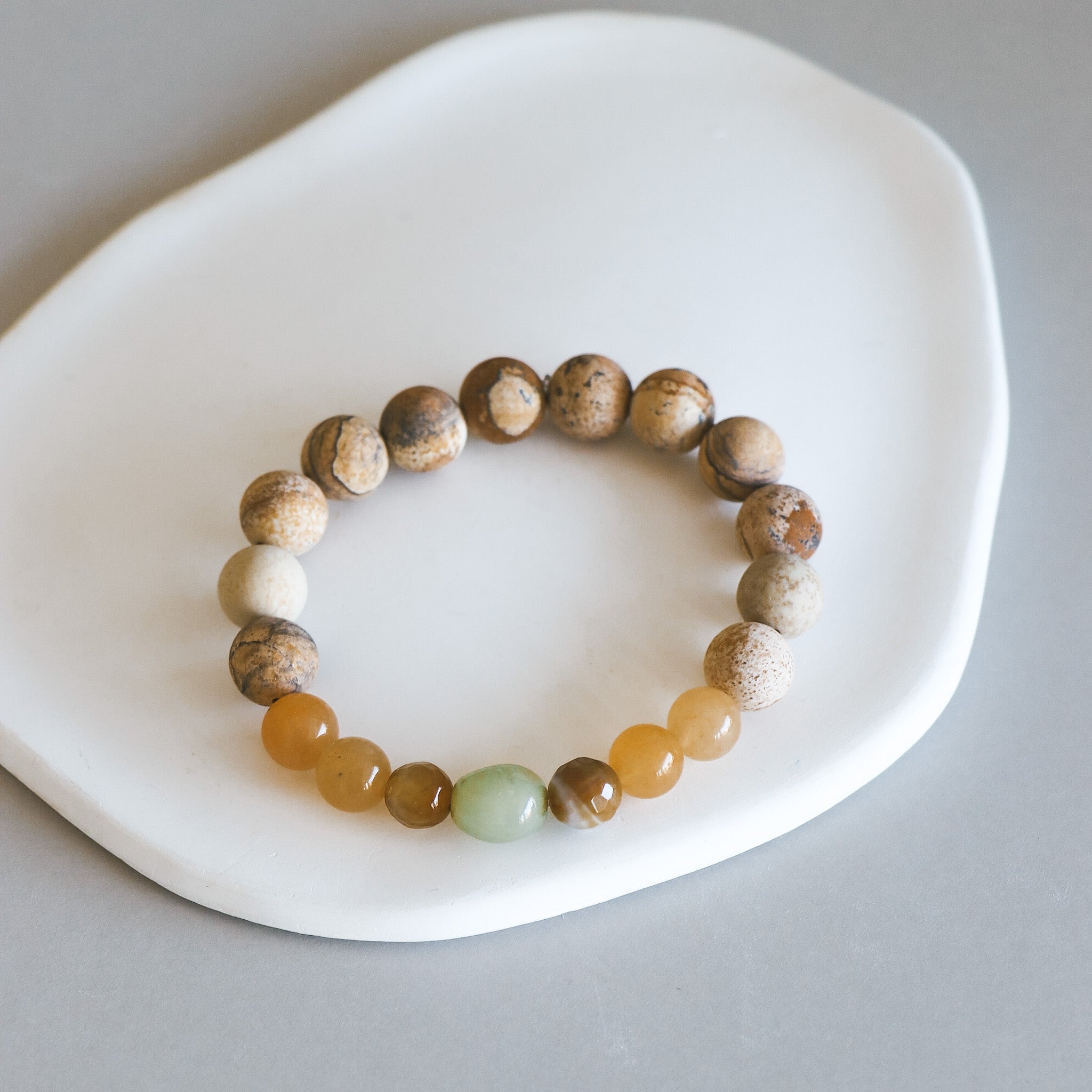 Bracelet en billes de pierres naturelles au fini mat dans les teintes de beige et brun. En fil élastique.