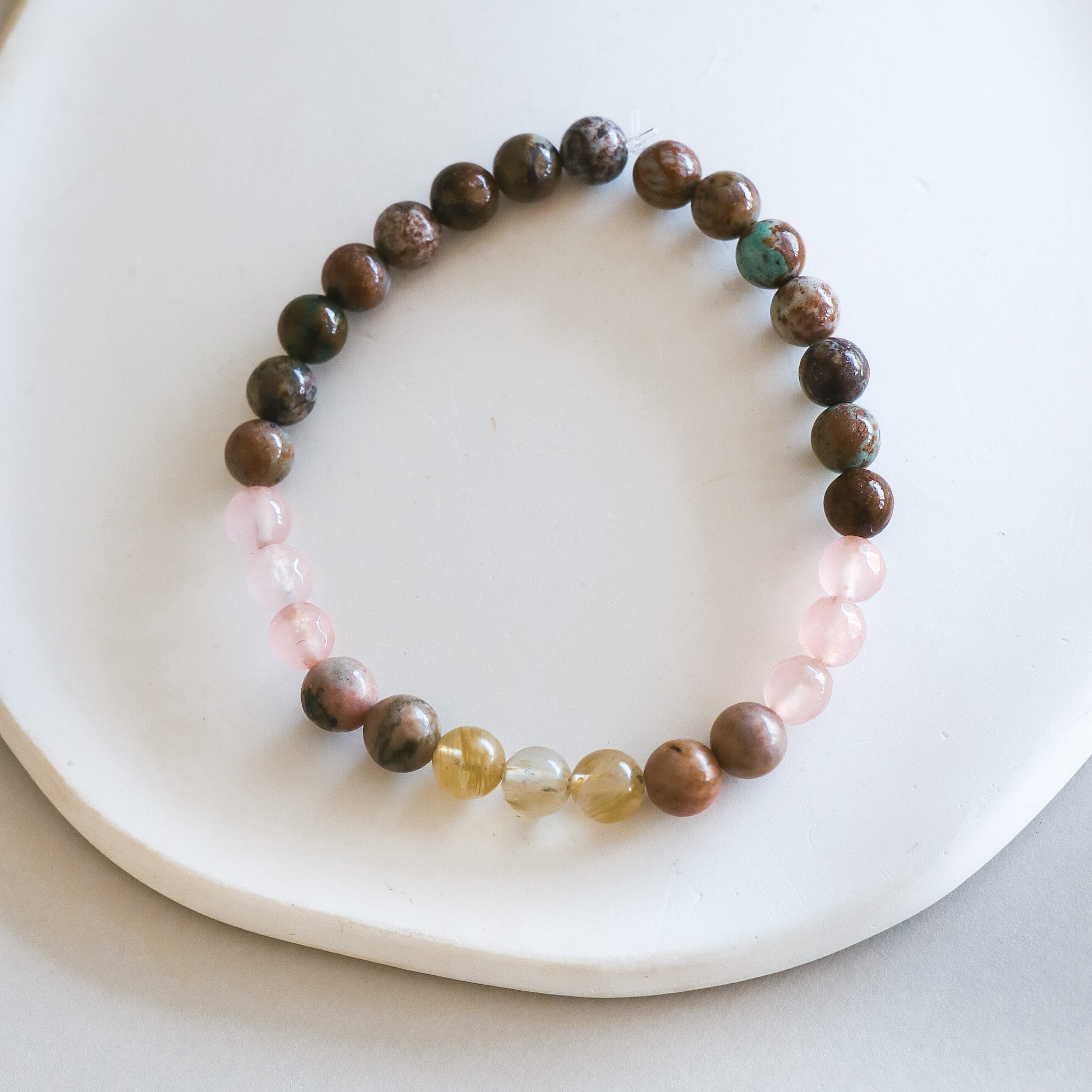 Bracelet en billes de pierres naturelles brunes, roses et beiges. En fil élastique.
