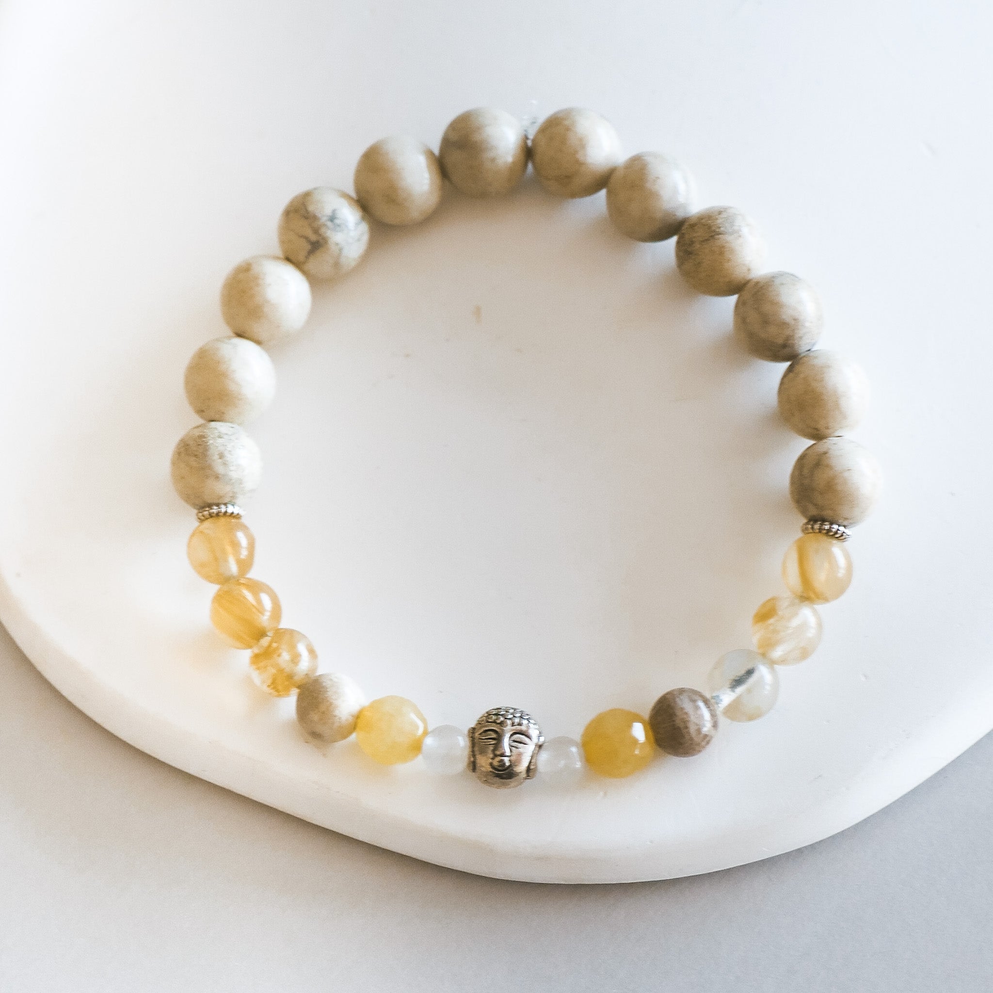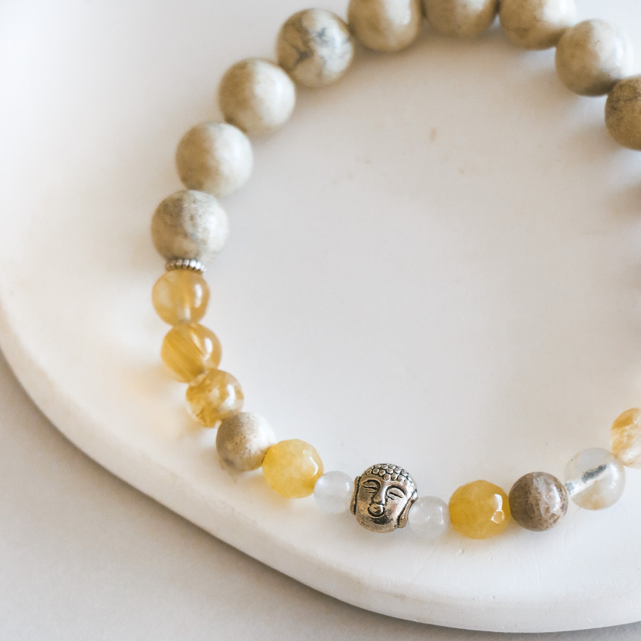 Bracelet en billes de pierres naturelles mixtes dans les teintes de gris-beige. Avec petite bille en tête de buddha et détails de couleur argent. En fil élastique.