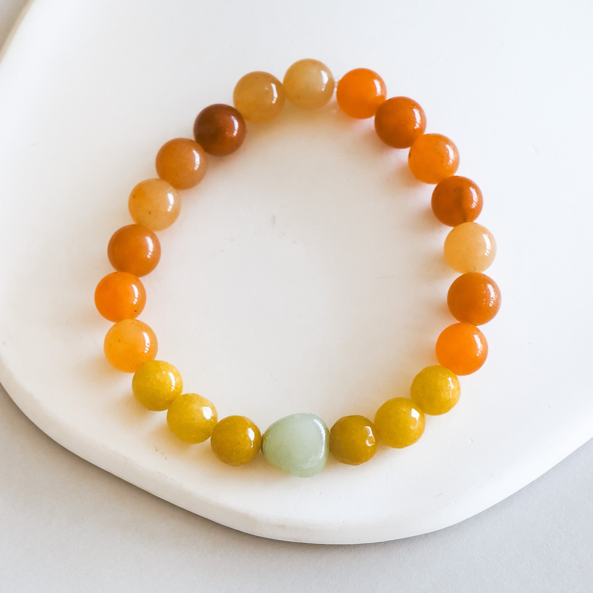 Bracelet en billes de pierres naturelles mixtes dans les teintes d'orange brulé, jaune et sauge. En fil élastique.