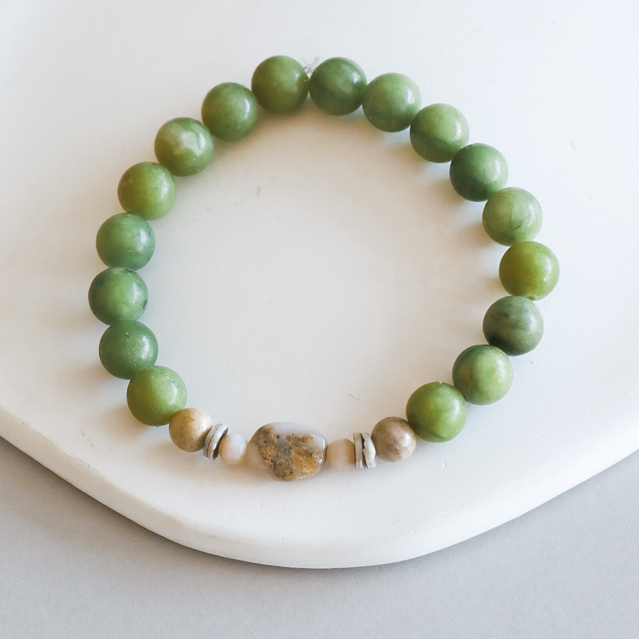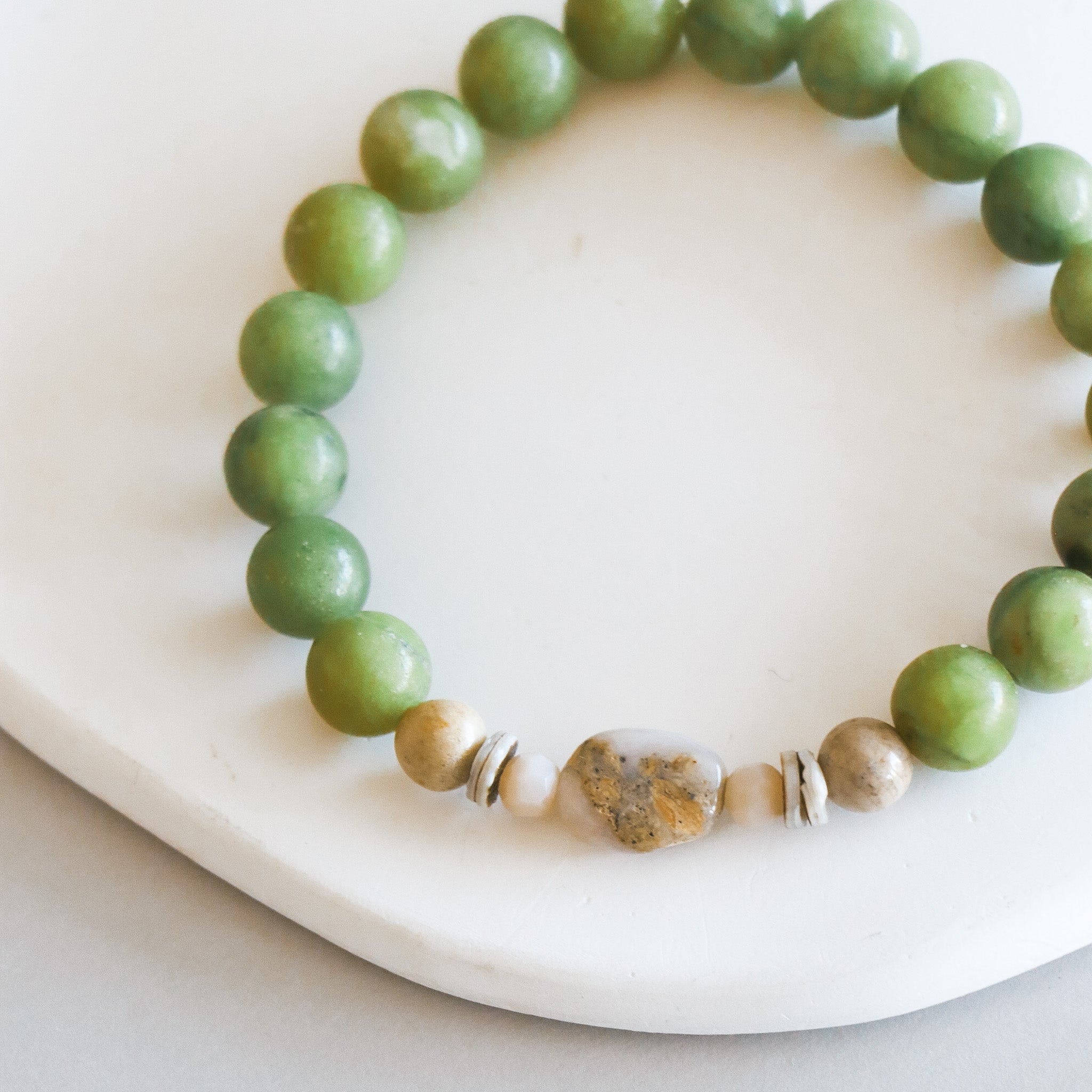Bracelet en billes de pierres naturelles mixtes dans les teintes de vert et beige/brun. En fil élastique.