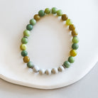 Bracelet en billes de pierres naturelles mixtes dans les teintes de vert et gris pâle avec détails argent. En fil élastique.