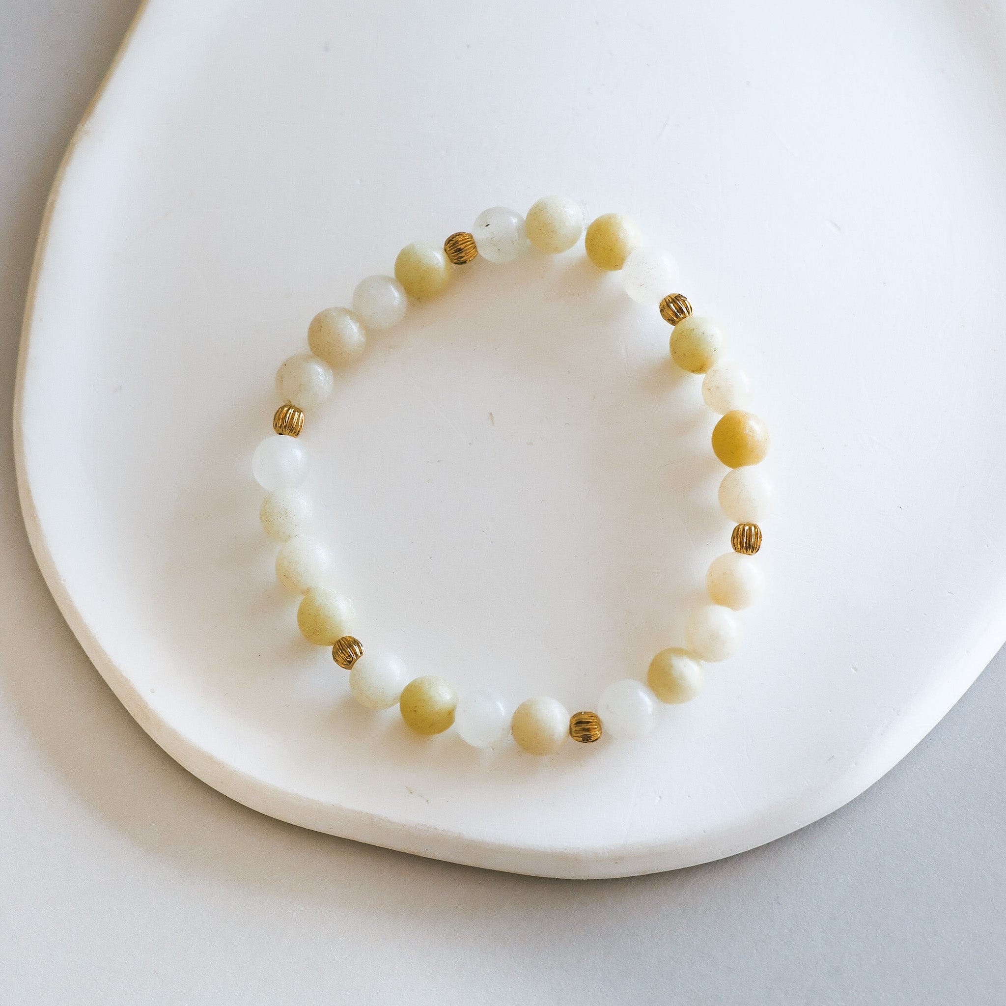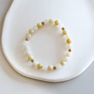 Bracelet en billes de pierres naturelles mixtes dans teintes de beige et détails dorés. En fil élastique.