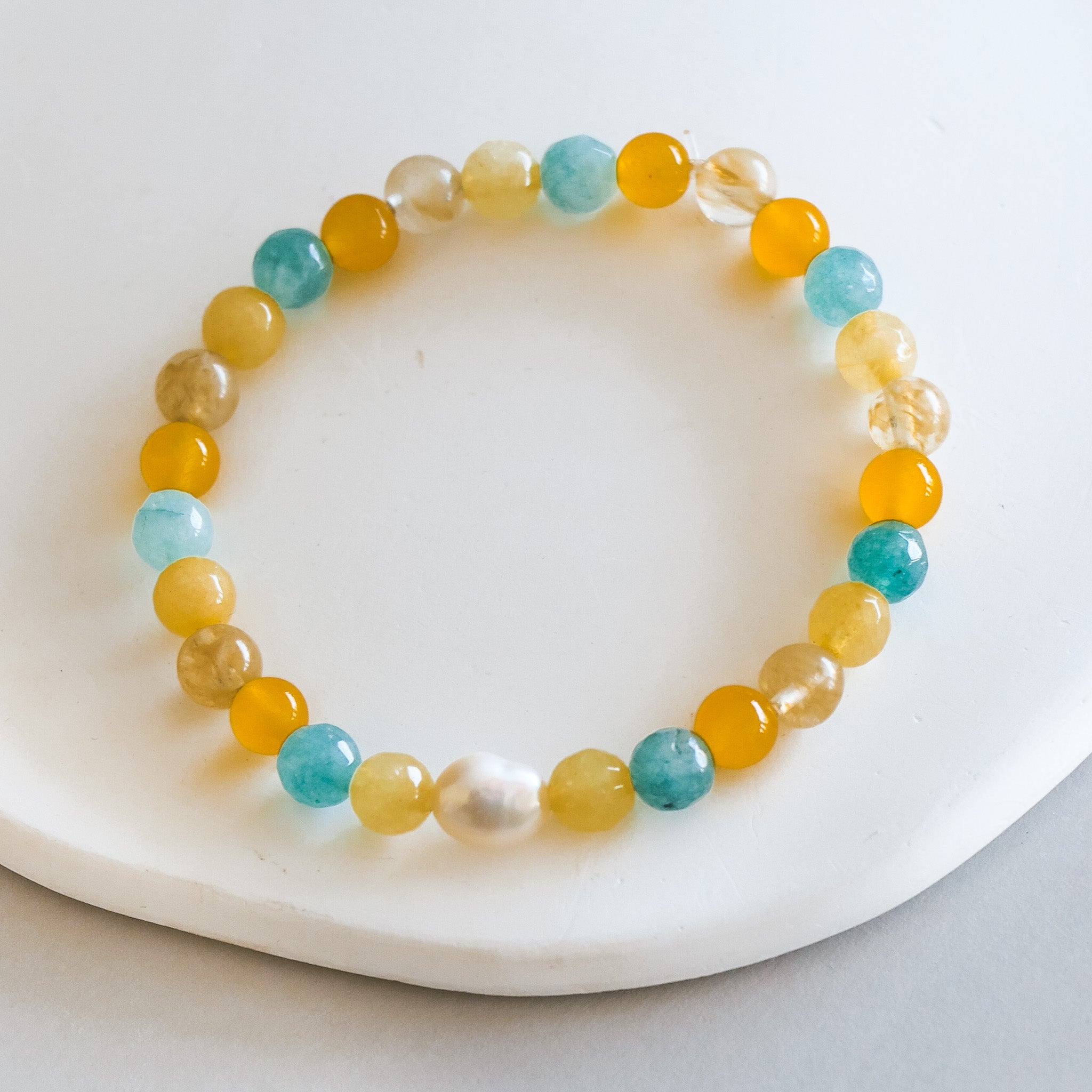 Bracelet en billes de résine colorées avec perle d'eau douce en son centre. En fil élastique.