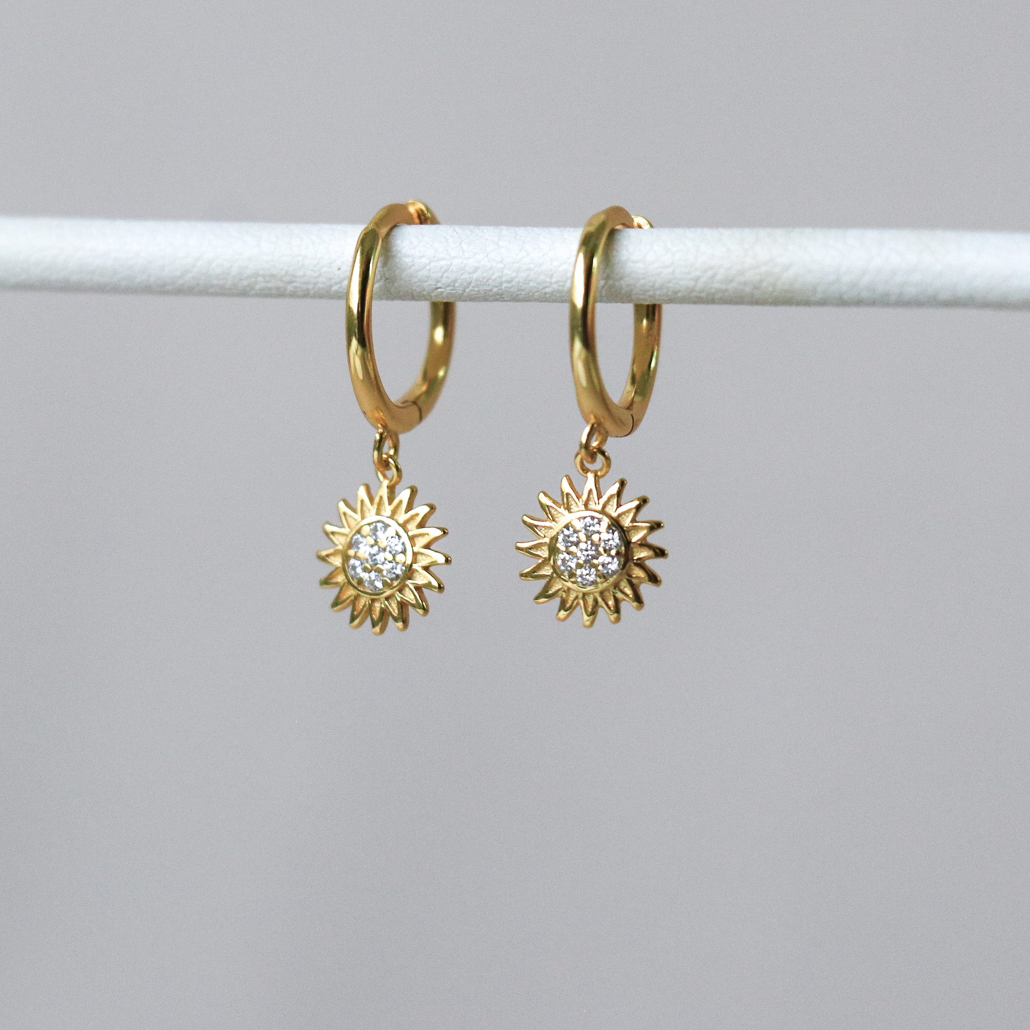 Boucles d'oreilles de type anneaux dormeuses avec breloque de fleur de tournesol incrustée de petits zircons.