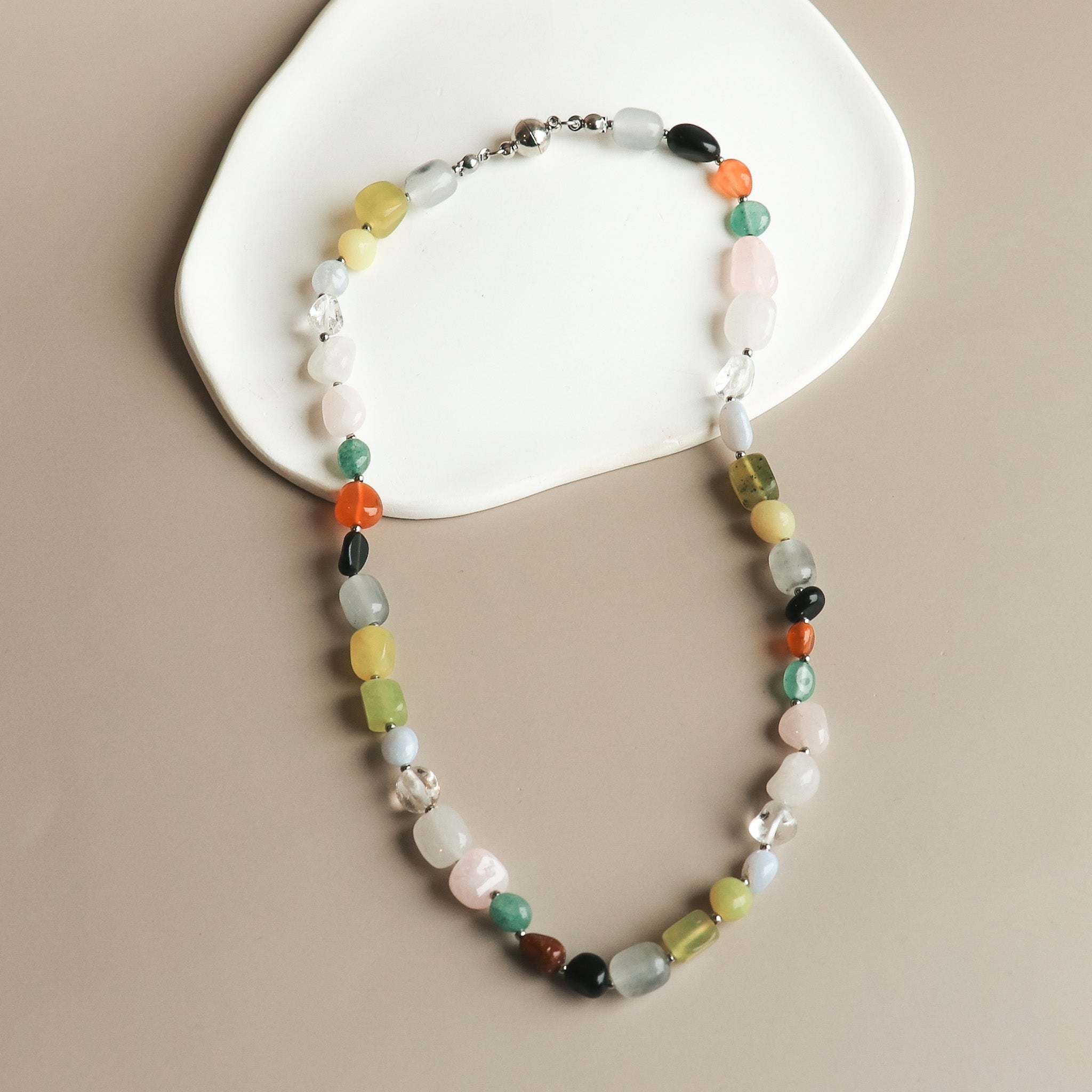 Collier près du cou composé de pierres naturelles variées de tailles et de couleurs assorties. L'attache est un aimant rendant le collier encore plus facile à mettre et à enlever.