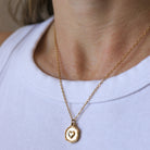 Collier en chaîne délicate avec pendentif de forme légèrement irrégulière et un coeur en son centre.