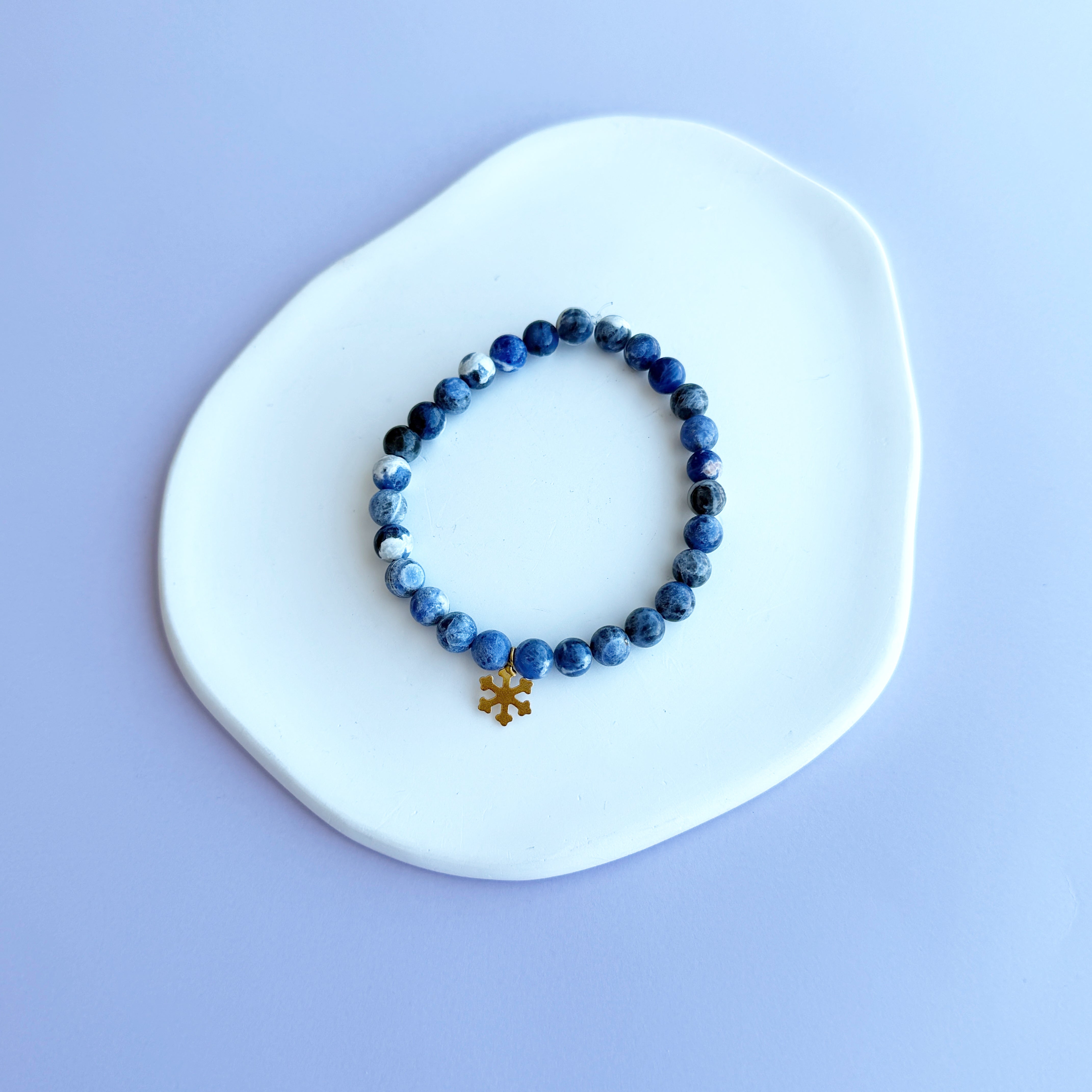 Bracelet en billes de pierres naturelles mixtes bleues et blanches avec petit pendentif en forme de flocon de neige. En fil élastique.