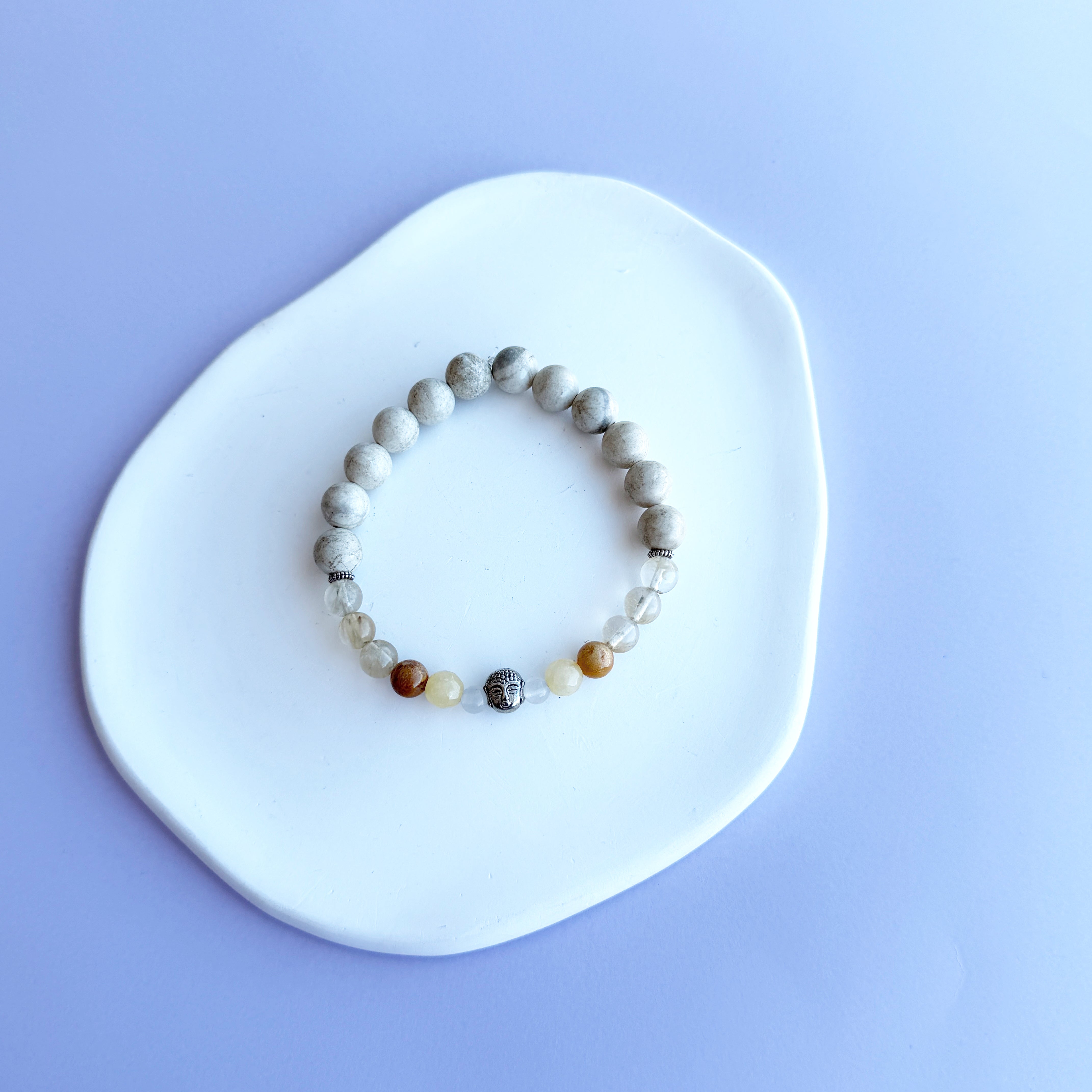 Bracelet en billes de pierres naturelles mixtes dans les teintes de gris-beige. Avec petite bille en tête de buddha et détails de couleur argent. En fil élastique.
