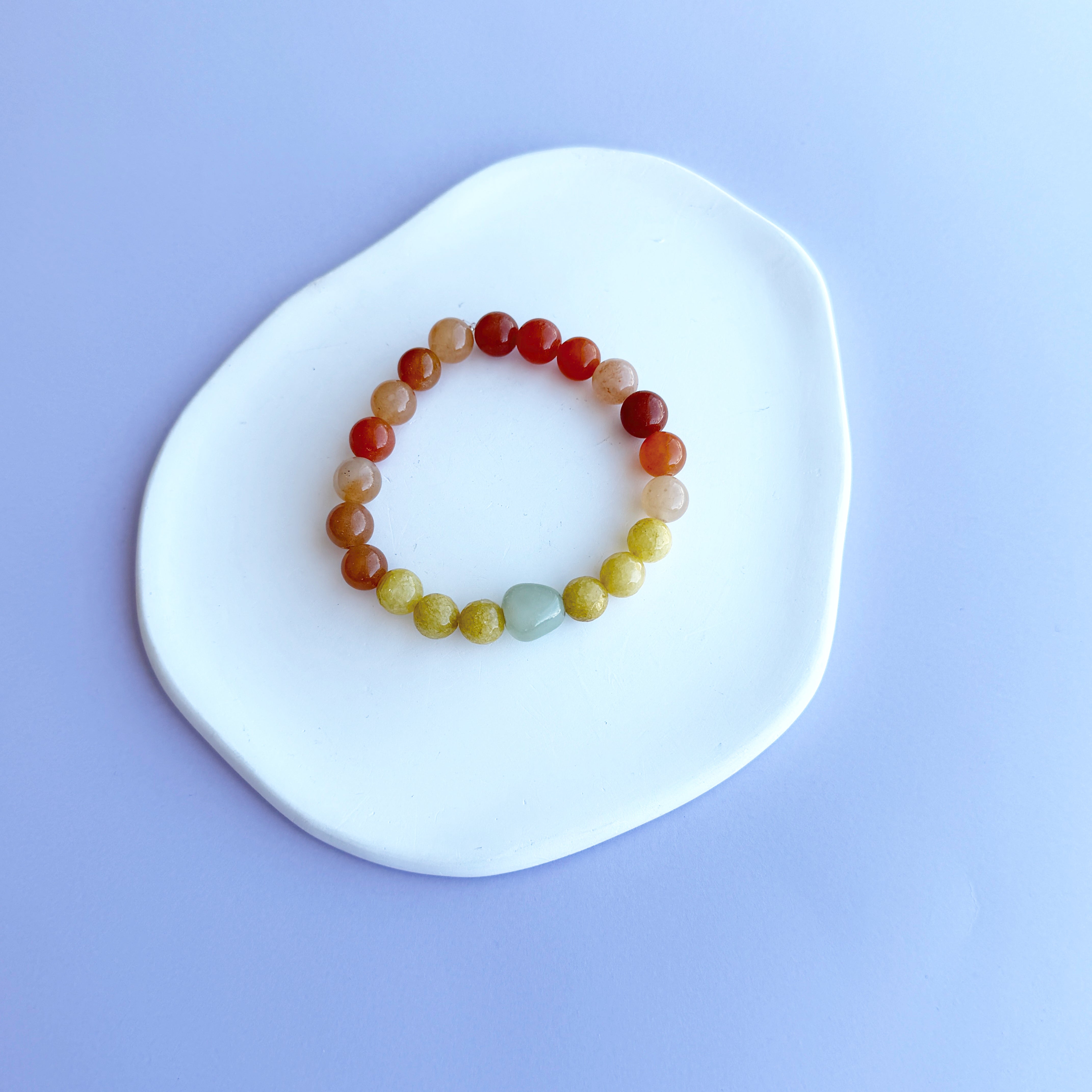 Bracelet en billes de pierres naturelles mixtes dans les teintes d'orange brulé, jaune et sauge. En fil élastique.