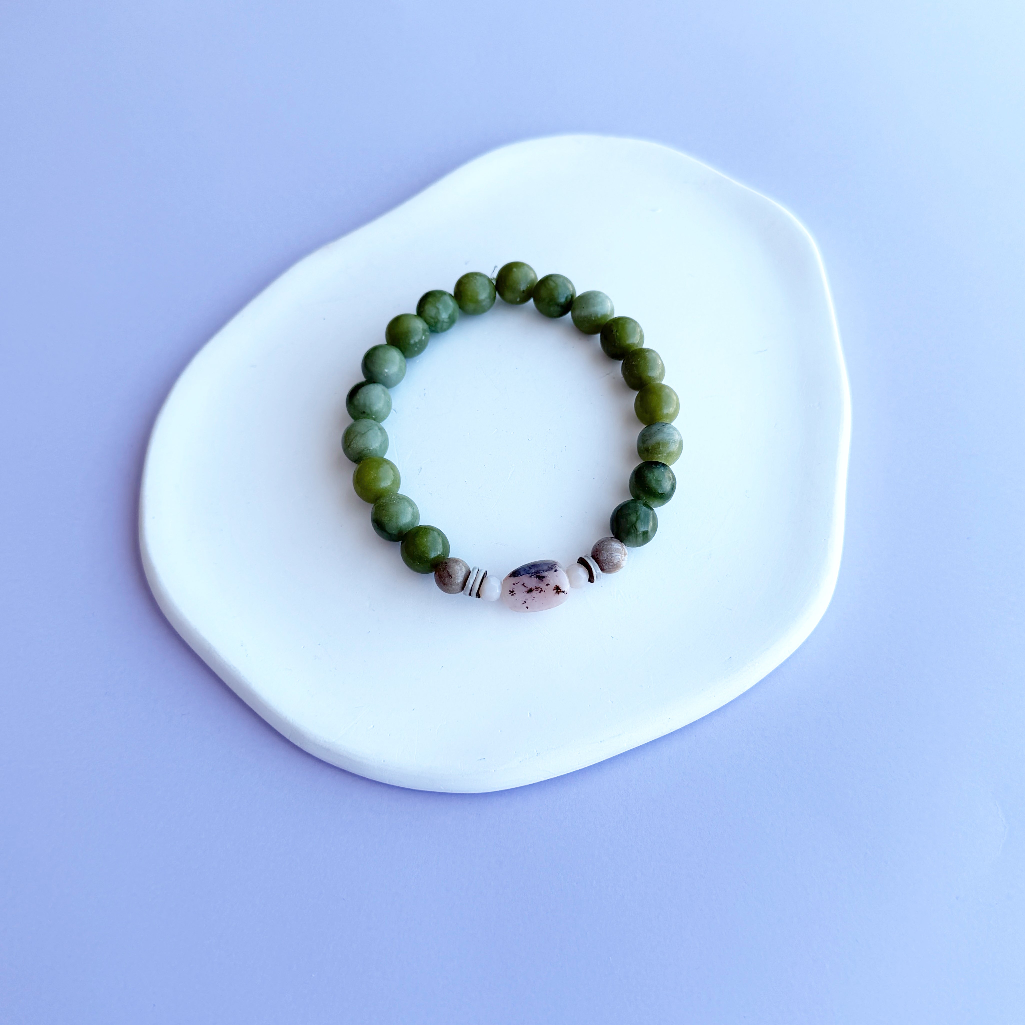Bracelet en billes de pierres naturelles mixtes dans les teintes de vert et beige/brun. En fil élastique.