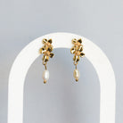 Boucles d'oreilles avec une tige composées de deux petites fleurs et une perle d'eau douce pendante.