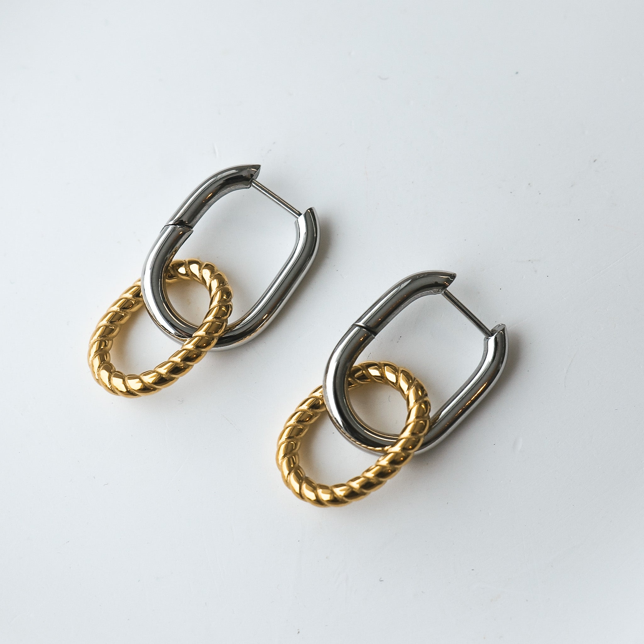 Boucles d'oreilles de style deux couleurs. Elle sont composées d'anneaux de forme ovale argent avec pendentif torsadé or.