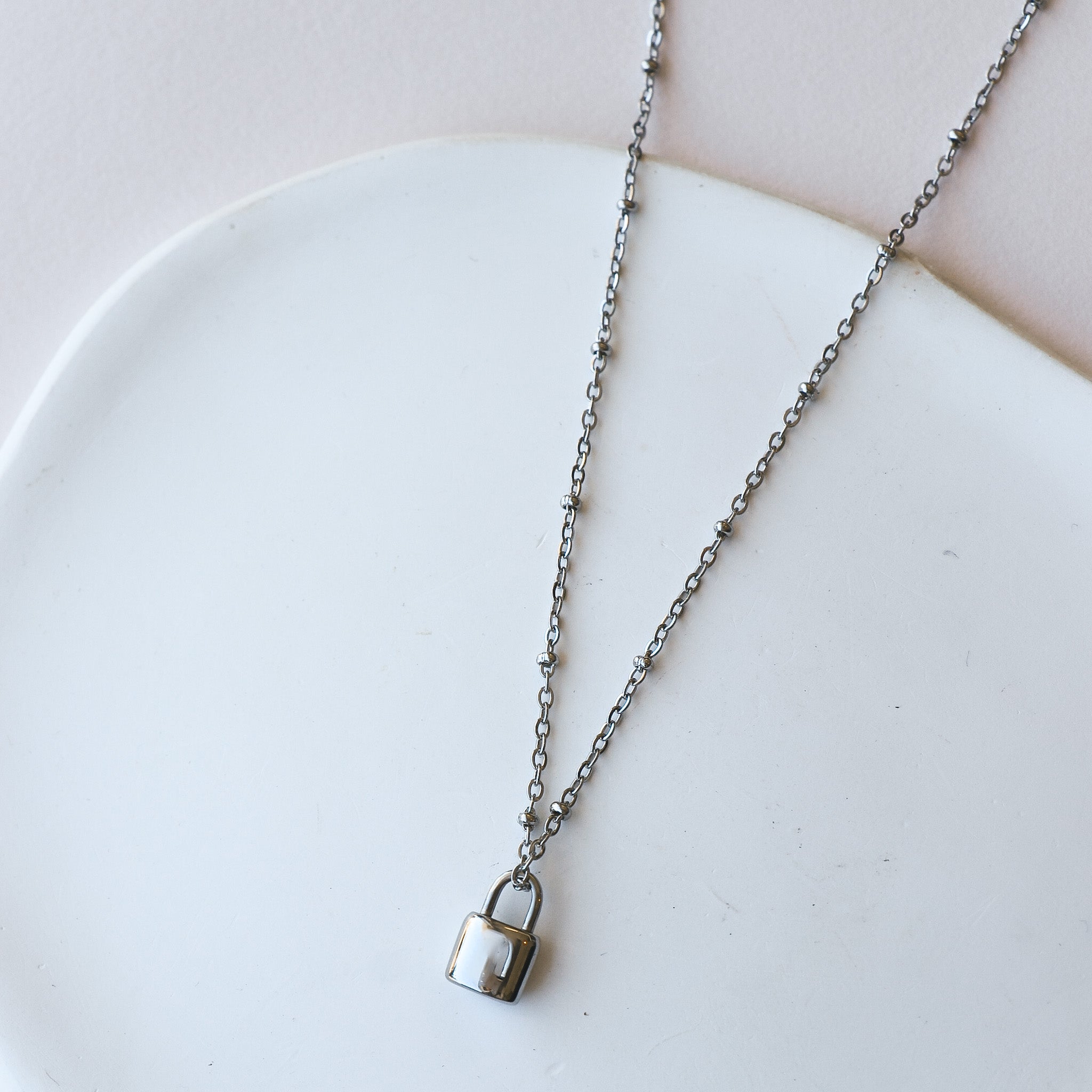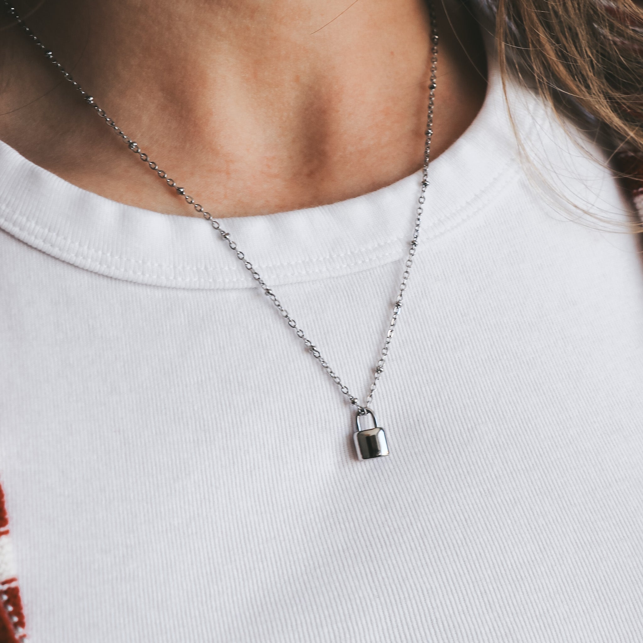 Collier composé d'une chaîne de type satellite avec pendentif en forme de cadenas.