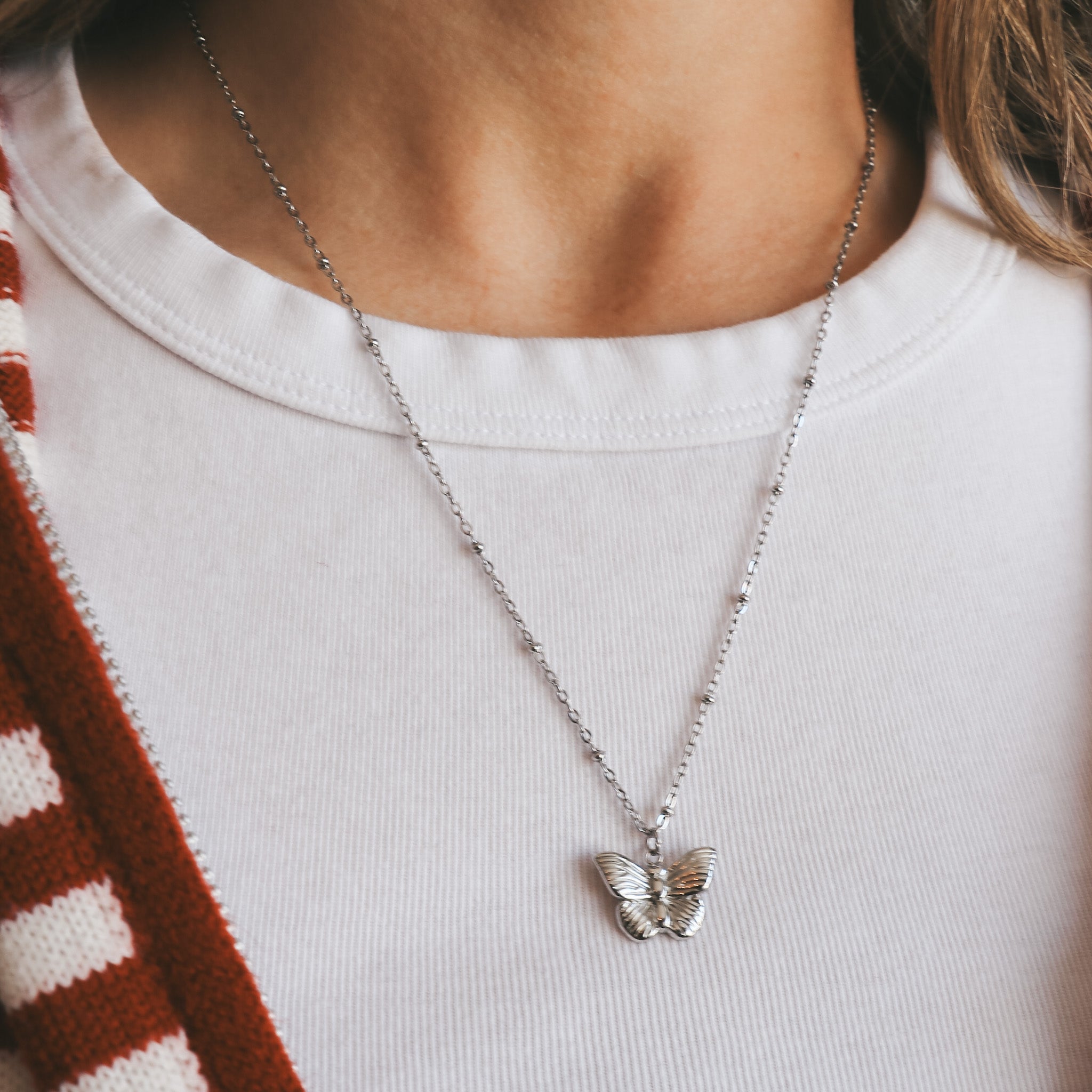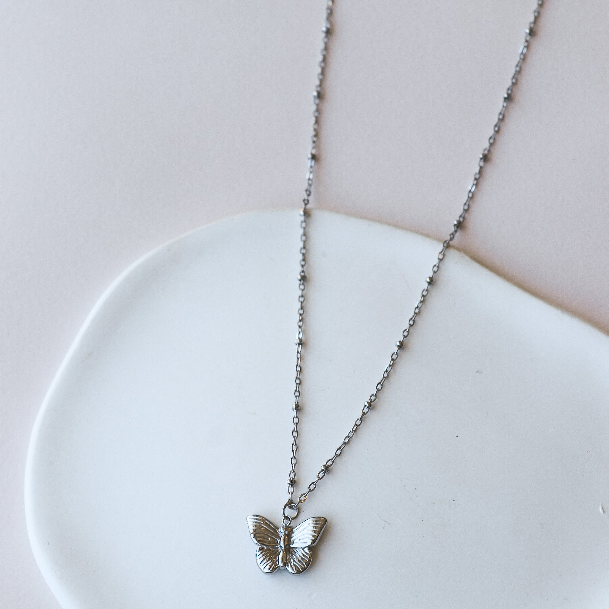 Collier composé d'une chaîne de type satellite et d'un pendentif en forme de papillon. Affichez votre style avec ce collier qui rappelle l'été.