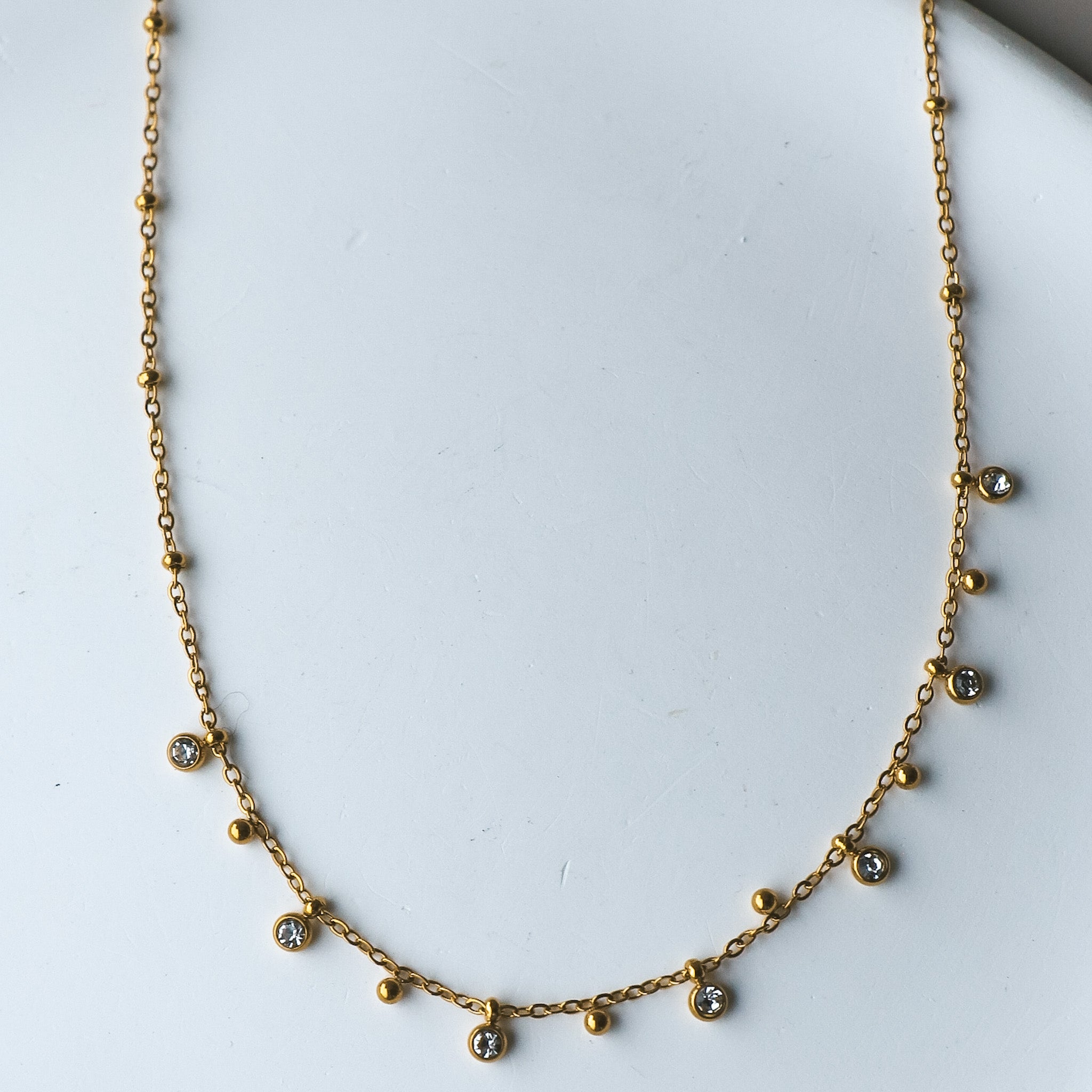 Collier délicat en chaîne satellite, composé de petites billes et zircons ronds.